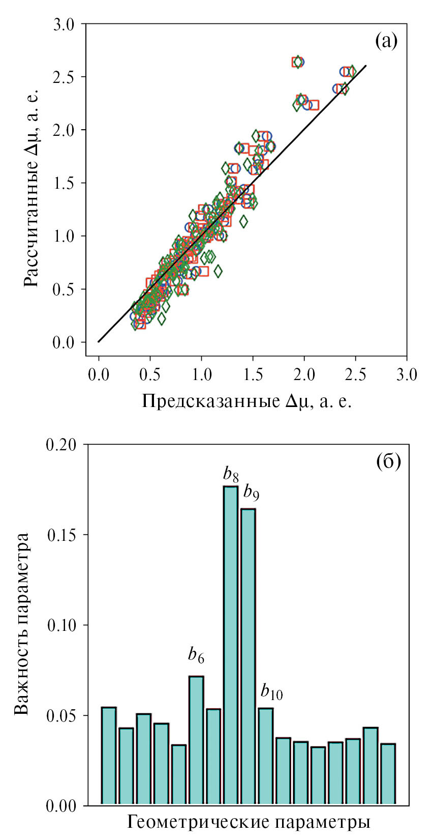 Рис. 4. Предсказанные и рассчитанные значения изменения дипольного момента при возбуждении (а) для моделей случайных лесов, построенных с использованием 17 (кругами), 4 (квадратами) и 2 геометрических параметров (ромбами). Значимость геометрических параметров в модели с 17 параметрами (б). Слева направо: длины связей по порядку b₁ – b₁₅ и двугранные углы d1 и d₂. Наиболее важные параметры имеют подпись.