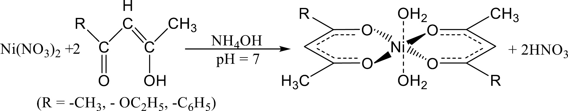 Ацетилацетонат и этилацетоацетат получали взаимодействием растворенного в 20 мл H2O нитрата никеля (0.01 моль) при 45°С с ацетилацетоном (0.05 моль) и ацетоуксусным эфиром (0.05 моль) и 2 мл NH4OH (рН = 6–7). Осажденные комплексы фильтровали, промывали дистиллированной водой и перекристаллизовывали из этанола.