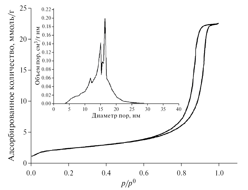 Для расчета удельных площадей поверхности полученных материалов использовали метод многоточечного измерения БЭТ по низкотемпературной адсорбции N2 (“Tristar 2030” (Micromeritics, USA) [13]. Образцы исходного и модифицированного Силипора 200 подвергали предварительной дегазации в вакууме при 423 К в течение 2 ч (погрешность метода ±10%). Методом BJH вычисляли размеры пор по данным десорбционной ветви изотермы адсорбции (p/p° → 0.99, где р° – давление насыщенных паров адсорбата, p/p° – относительное давление пара).