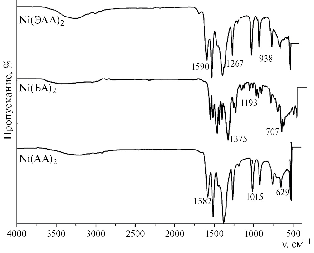 В области 1700–1000 см⁻¹ (рис. 3) проявляются валентные симметричные и ассиметричные колебания основных функциональных групп ацетилацетона, бензоилацетона и ацетоуксусного эфира: ν(С–О), ν(С=О), ν(С–С), ν(С=С), валентные ν(С–С), ν(С–Н) колебания фенильной группы бензоилацетона и деформационные колебания δ(С–Н) хелатного кольца комплексов. Карбонильная группа сопряженной системы νа(С=С–С=О) характеризуется в ИК-спектре колебаниями, зарегистрированными при 1598–1551 см⁻¹. Полосы поглощения в области 1515–1510 см⁻¹ соответствуют валентным колебаниям ν(О–С=С–С) β-дикарбонильного лиганда в енольной форме, координированного ионом никеля.