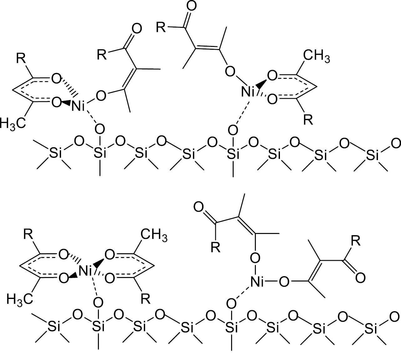 В результате модифицирования Силипора 200 комплексами ацетилацетона, бензоилацетона, ацетоуксусного эфира хелаты могут адсорбироваться на гидроксильных группах его поверхности за счет межмолекулярных взаимодействий, локализованы на стенках пор кремнезема или за счет образования связей Si–O- -Ni (рис. 5).