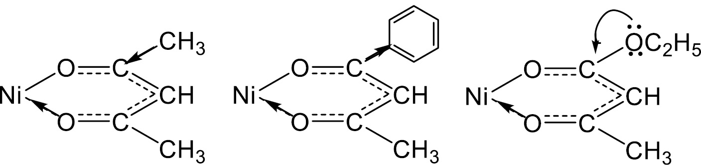 Исследование адсорбционных свойств поверхности кремнезема, расчет термодинамических характеристик проводили с применением ароматических углеводородов в качестве адсорбатов. На характеристики адсорбции влияет строение лиганда и распределение электронной плотности в молекуле модификатора (рис. 6), связанные с проявлением электронных эффектов, в частности, положительного индуктивного эффекта для метильной группы в ацетилацетонате, положительного мезомерного эффекта этокси-группы в этилацетоацетатном комплексе, а также электроотрицательным влиянием фенильного заместителя в бензоилацетонате никеля (II). Наличие 6π-электронной системы в бензоилацетонате обуславливает также дополнительную возможность специфических межмолекулярных взаимодействий с некоторыми сорбатами.