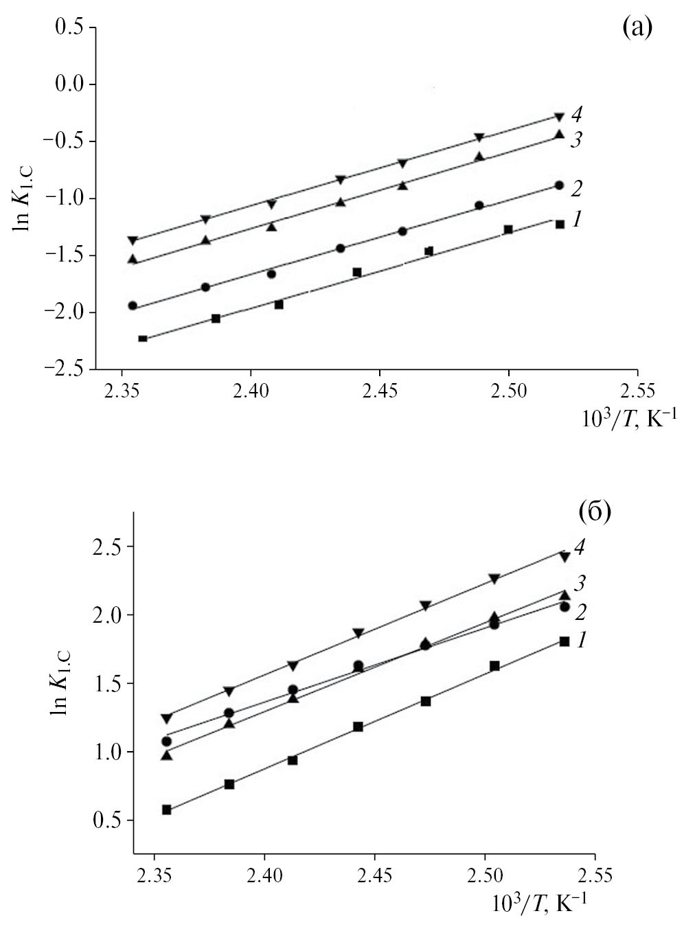 8. Рис. 7. Зависимости логарифма константы Генри адсорбции бензола (а) и нафталина (б) от обратной температуры на исходном Силипоре 200 (1) и модифицированном ацетилацетонатом никеля (2), бензоилацетонатом никеля (3), этилацетоацетатом никеля (4).