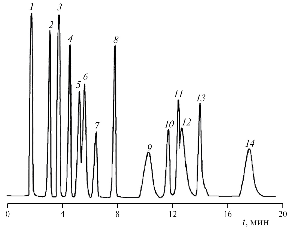 Рис. 9. Хроматограмма смеси алкилзамещенных и полиароматичских углеводородов на насадочной колонке, заполненной Силипором 200, модифицированным бензоилацетонатом никеля, в режиме программирования температуры от 150 до 250°C (скорость нагрева 10°C/мин): 1 – бензол, 2 – толуол, 3 – этилбензол, 4 – п-ксилол, 5 – м-ксилол, 6 – о-ксилол, 7 – мезитилен, 8 – псевдокумол, 9 – п-цимол, 10 – дурол, 11 – нафталин, 12 –дифенил, 13 – аценафтен, 14 – флуорен.