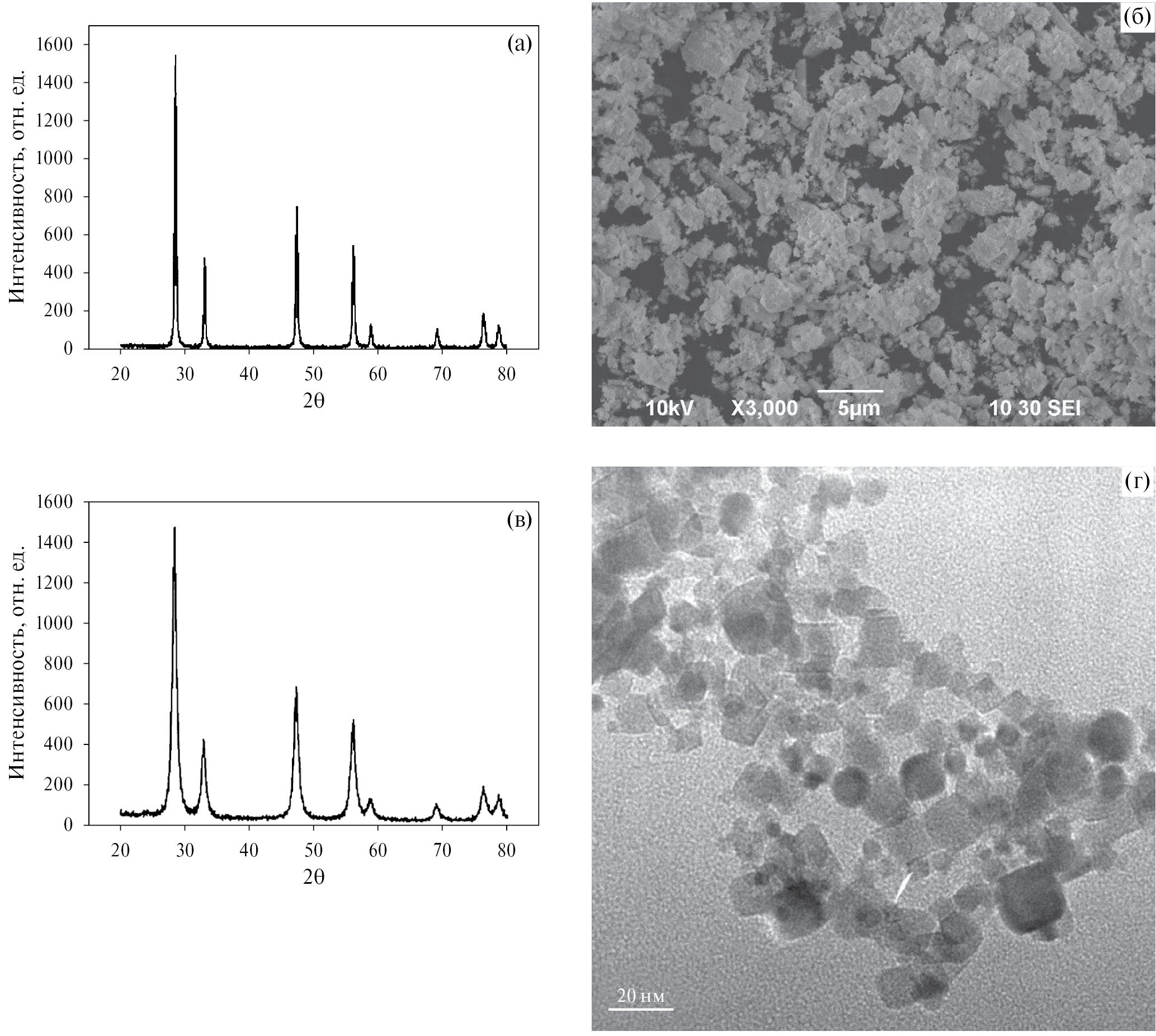 Рис. 1. Рентгенограммы для образцов SDC‐м (а) и SDC‐н (в); СЭМ-изображение морфологии микроразмерных частиц SDC‐м (б); ПЭМ-изображение морфологии наночастиц SDC‐н (г)