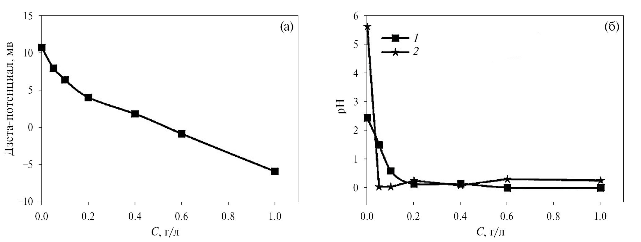 Рис. 2. Зависимости дзета-потенциала (а) и рН (б) от концентрации йода в суспензии 10 г/л SDC (1) и дисперсионной среде iPrOH/HAcAc (90/10 об. %, 2).