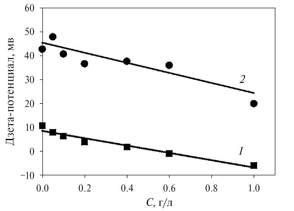 Изменение знака дзета-потенциала происходило в диапазоне концентраций йода 0.4–0.6 г/л.