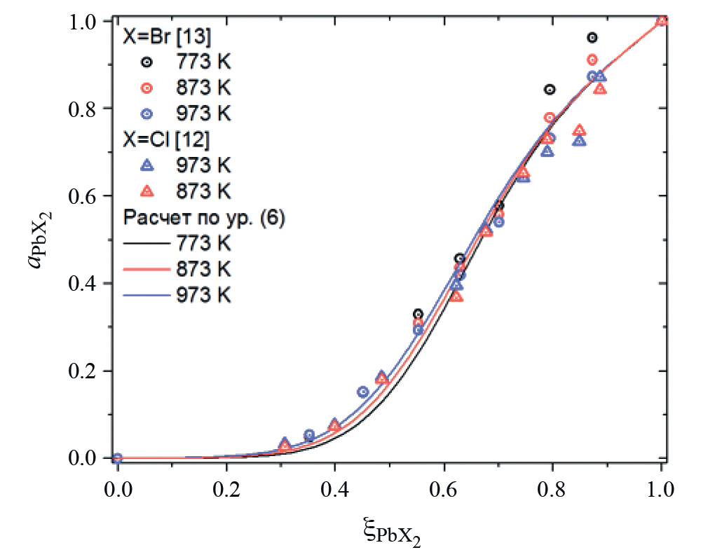 Как видно из рис. 3, в целом достигается неплохое согласие экспериментальных и расчетных значений активностей галогенидов PbX2 (X=Cl, Br), что также служит дополнительным подтверждением корректности полученных результатов по энтальпиям смешения.