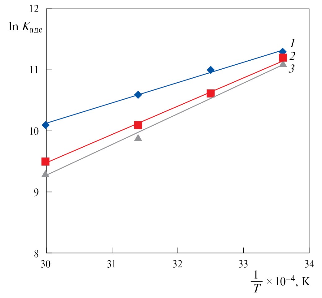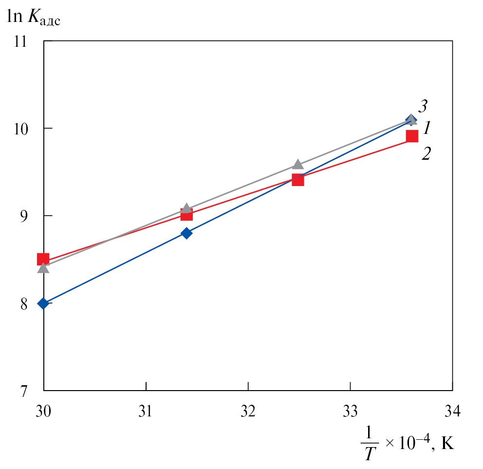 В табл. 3 и 4 приводятся вычисленные значения констант равновесия адсорбции (Кaдс) и термодинамические показатели процесса адсорбции (ΔGaдc, ΔHaдc, ΔSaдc).
