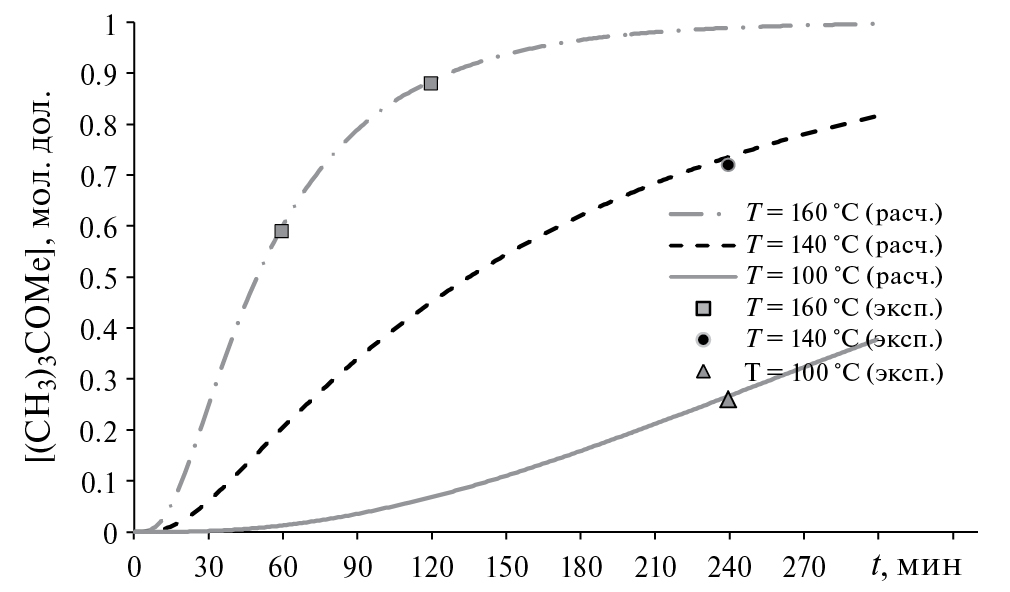 Аналогично, на рис. 3 и 4 приведены кинетические зависимости (экспериментальные и расчетные) образования метил-трет-бутилового эфира с использованием катализаторов HY и CuBr2/HY.