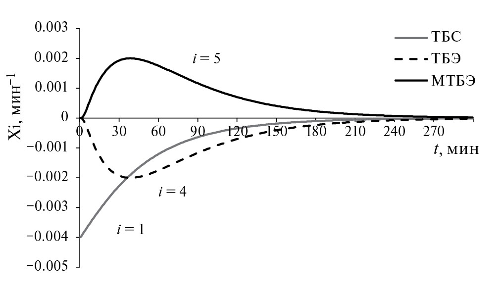 Разработанная модель позволяет наблюдать изменение скоростей расходования (образования) ключевых веществ трет-бутилового спирта (ТБС), трет-бутилового эфира (ТБЭ) и МТБЭ от времени в присутствии катализатора HY (рис. 5) и катализатора CuBr2/HY. Так как графики изменения скоростей почти идентичны, то в статье отображен рисунок только для катализатора HY. Трет-бутиловый спирт (i = 1) активно расходуется с начала проведения реакции, т. к. запаянную ампулу в автоклаве нагревали при температурах выше температуры кипения вещества, в связи с чем происходит конденсация и адсорбция вещества. Скорость изменения трет-бутилового эфира (i = 4) и МТБЭ (i = 5) по формулам отличаются только знаком, что и видно по графику. Пока трет-бутиловый эфир постепенно расходуется в это же время с аналогичной скоростью медленно образуется МТБЭ.
