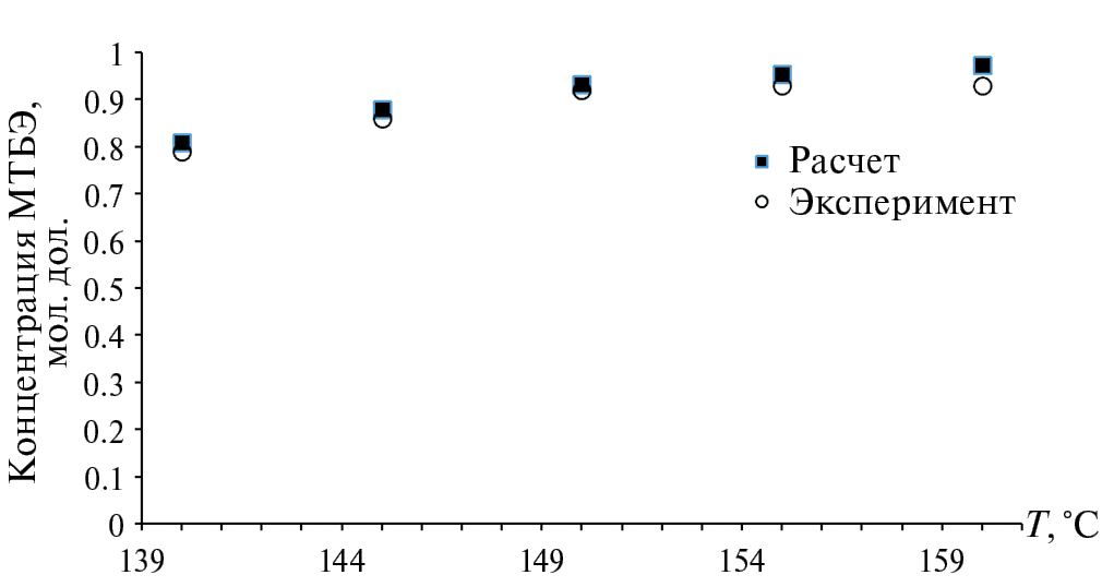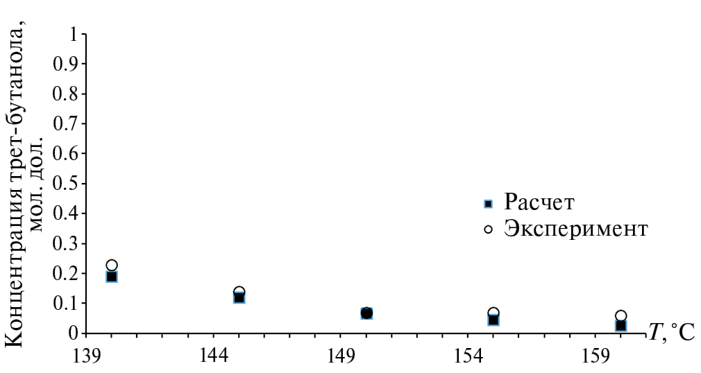 Представленная модель позволяет оценить влияние температуры на каталитическую активность катализатора HY, а именно на содержание трет-бутанола и метил-трет-бутилового спирта в реакционной массе (рис. 8 и 9), что свидетельствует об адекватности предложенной модели процесса.