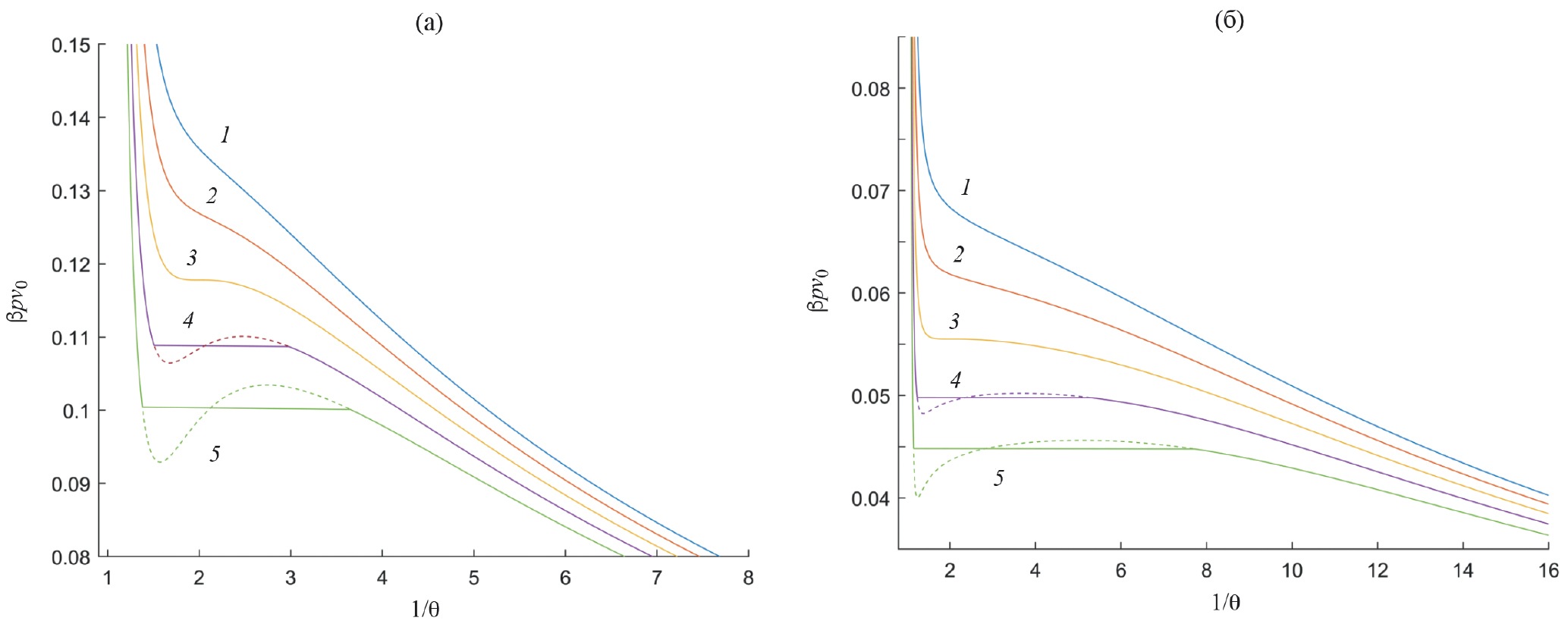 На рис. 1 для двух субкритических изотерм 4 и 5 пунктиром указаны положения секущих, проведенных по правилу Максвелла [5, 22, 23]. Пересечения секущих с кривыми изотермами определяют положения точек бинодали при данной температуре. Эти точки бинодали сходятся в точке перегиба для кривой 3, определяющей положение критической точки. Такого рода кривые хорошо известны в литературе [2, 5, 20, 22, 23]. Вид изотерм сильно зависит от приближения КВМ расчета, связанного с размером базисного кластера. Чем больше размер базисного кластера, тем точнее выполняется расчет и это приводит к смещению кривых изотерм к меньшим значениям безразмерных давлений βРv0.