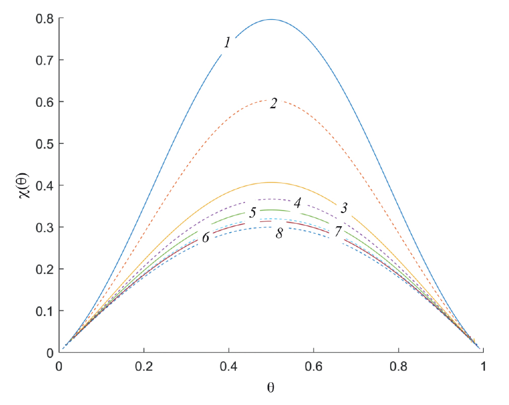 С ростом температуры средне-квадратичные флуктуации существенно уменьшаются, однако их величина продолжает оставаться больше, чем флуктуации для идеальной системы χ0 (θ) = θ (1 – θ). Кривая для χ0 (θ) не имеет точек перегиба, тогда как для систем с притягивающимися молекулами на рис. 4 наблюдаются резкие увеличения кривых χ (θ) при стремлении слева для пара и справа для жидкости к точкам бинодали при субкритических температурах и в области средних плотностей при сверхкритических температурах. Если за основу взять условие отсутствия точек перегиба для кривых χ (θ) при плотностях меньше критической плотности (и симметрично – больше критической плотности), можно ввести понятие высокой температуры Т*, выше которой кинетическая энергия молекул превосходит их потенциальную энергию. Такая величина Т* может случить критерием на отсутствие влияния критической точки на характеристики флюида. На рис. 5 показаны флуктуации для высоких температур, Т > Тс, рассчитанные для кластера 3 × 4 и в КХП. С ростом температуры положение максимума флуктуаций смещается к величине χ0 (θ). При температурах порядка τ ~ 4.1 и выше точка перегиба на кривой флуктуаций χ (θ), наблюдаемая на кривых 1–4, исчезает.
