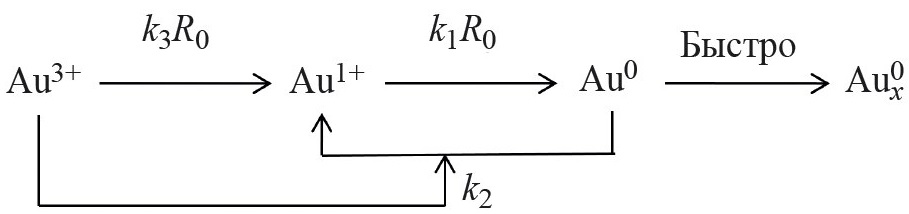 где R0 – постоянная концентрация восстановителя (R0 взято в большом избытке по сравнению с Au3+ восстановителя (R0 >> Au3+(0))); k1, k2, k3 – константы скоростей соответствующих стадий; Au0x – ассоциаты атомов золота, из которых формируются наночастицы металла.