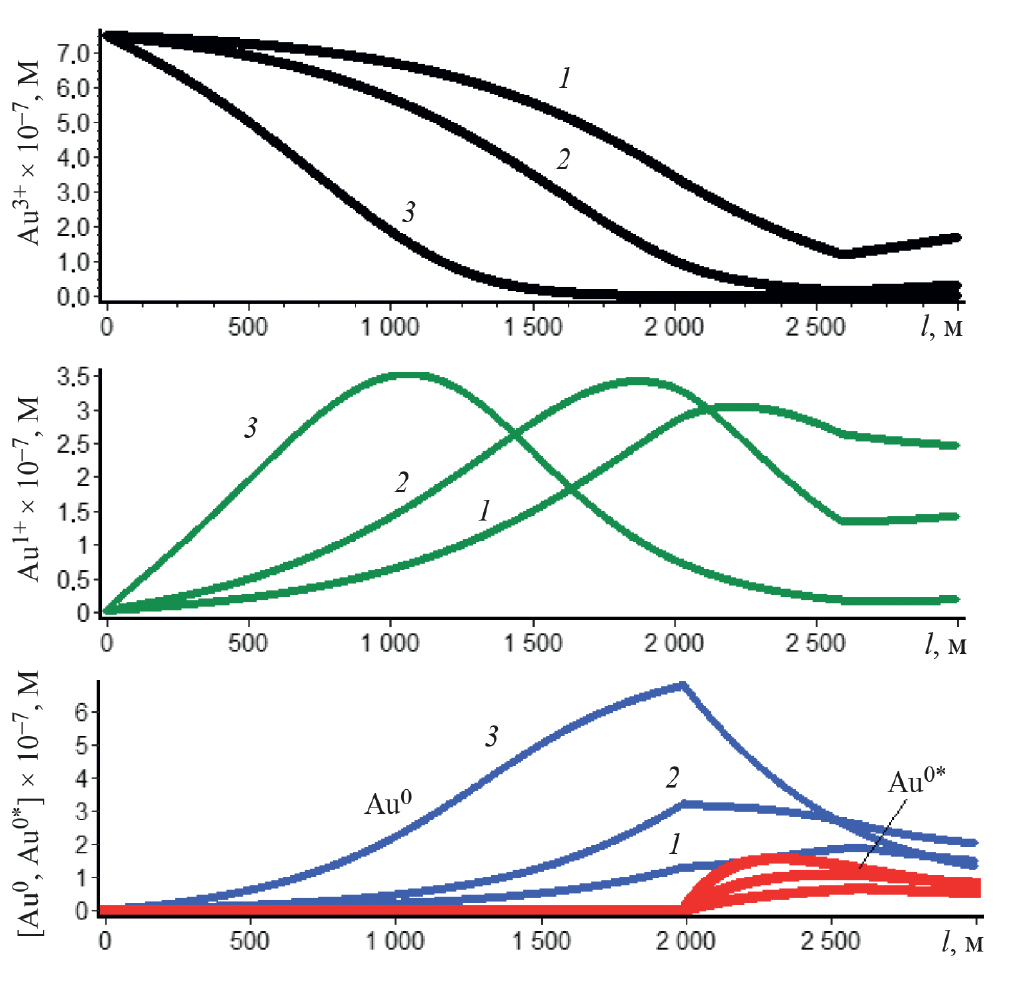 На рис. 3 представлены расчетные данные изменения концентрации Au3+, Au1+ и Aux0 при вариации “затравочной” концентрации Au1+. Видно, что чем выше концентрация “затравки”, тем быстрее процесс при существенном уменьшении периода индукции. Аналогичные результаты получены при вариации начальной (“затравочной”) концентрации Aux0.