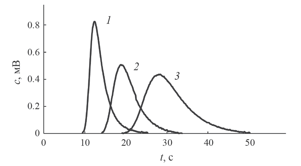 Рис. 1. Кривые входного сигнала при разных скоростях подвижной фазы, см3/мин: 1 – 31.6, 2 – 20.48 и 3 – 13.76.