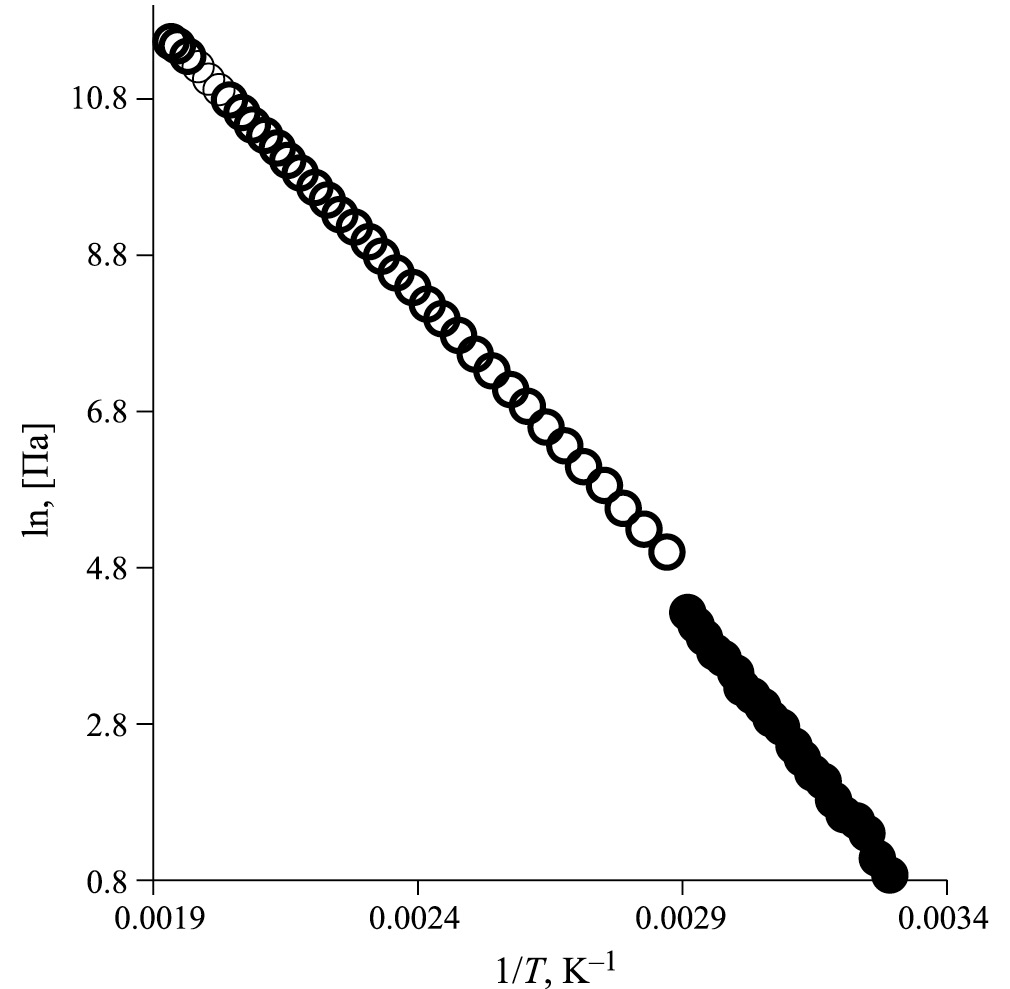 Полученные значения давлений насыщенных паров, значения DvapHo (298.15 K) и значения изменения теплоемкости перехода “газ-жидкость” () представлены в табл. 2, а на рис. 2 и 3 представлены зависимости логарифмов давлений насыщенных паров (полученных в данной работе и литературных данных [21]) от обратной температуры для диметил- и диэтилмалатов.