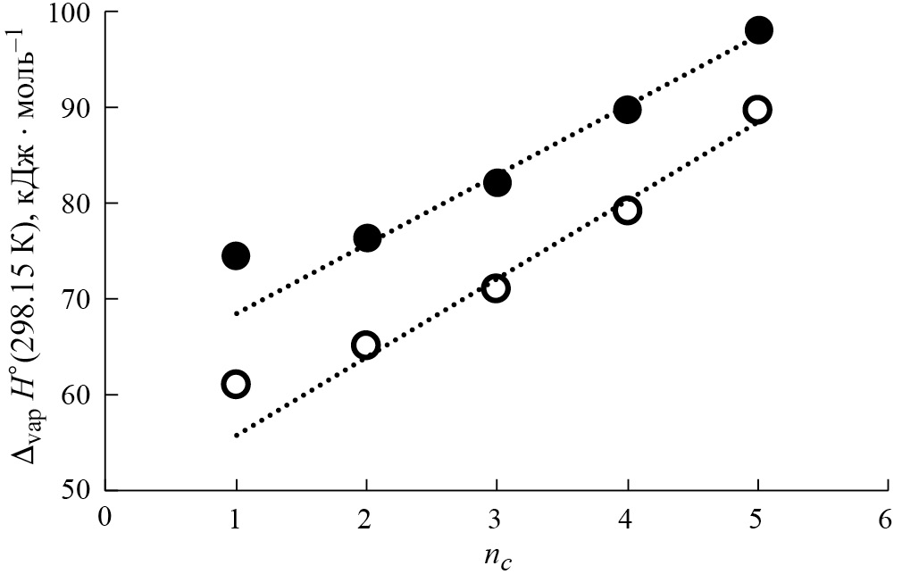 Коэффициенты регрессии (R2) в полученных уравнениях (1) и (2) показывают хорошую согласованность полученных результатов. Кроме того, эти уравнения могут быть использованы для расчета DvapHo (298.15 K) при nC>5.