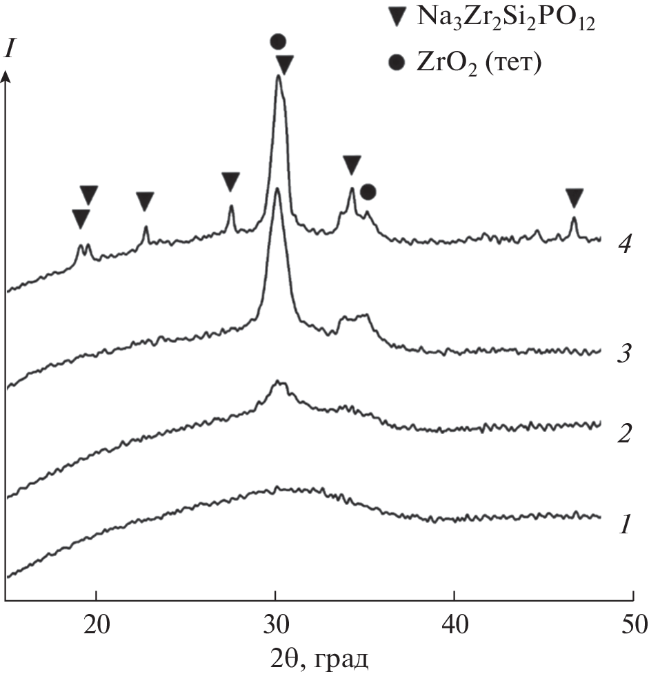A new promising method for the synthesis of NASICON (Na3Zr2Si2PO12) by pyrolysis of organic solutions has been developed. Sodium oleate, zirconyl oleate, tributyl phosphate, and tetraethoxysilane have been used as precursors. The molar ratios of the components of the mixture for the formation of NASICON have been established. The effect of sodium on the formation of the zirconium dioxide phase has been proven. A finely dispersed material with an average grain size of 0.2 µm has been obtained. Changes in morphology and composition depending on the time and temperature of firing the sample are studied. The results have been confirmed by X-ray powder diffraction and scanning electron microscopy. To refine the parameters of the crystal lattice, a full-profile analysis has been performed by the Rietveld method. The process of obtaining NASICON takes about 9 h, i.e. it is the least time consuming of all the alternative ways of synthesis. The advantages of this method are the possibility of lowering the sintering temperature, the absence of the need to control many parameters during synthesis, and minimizing the duration and multi-stage process. The method contributes to the development and production of more promising ion-substituted structures.