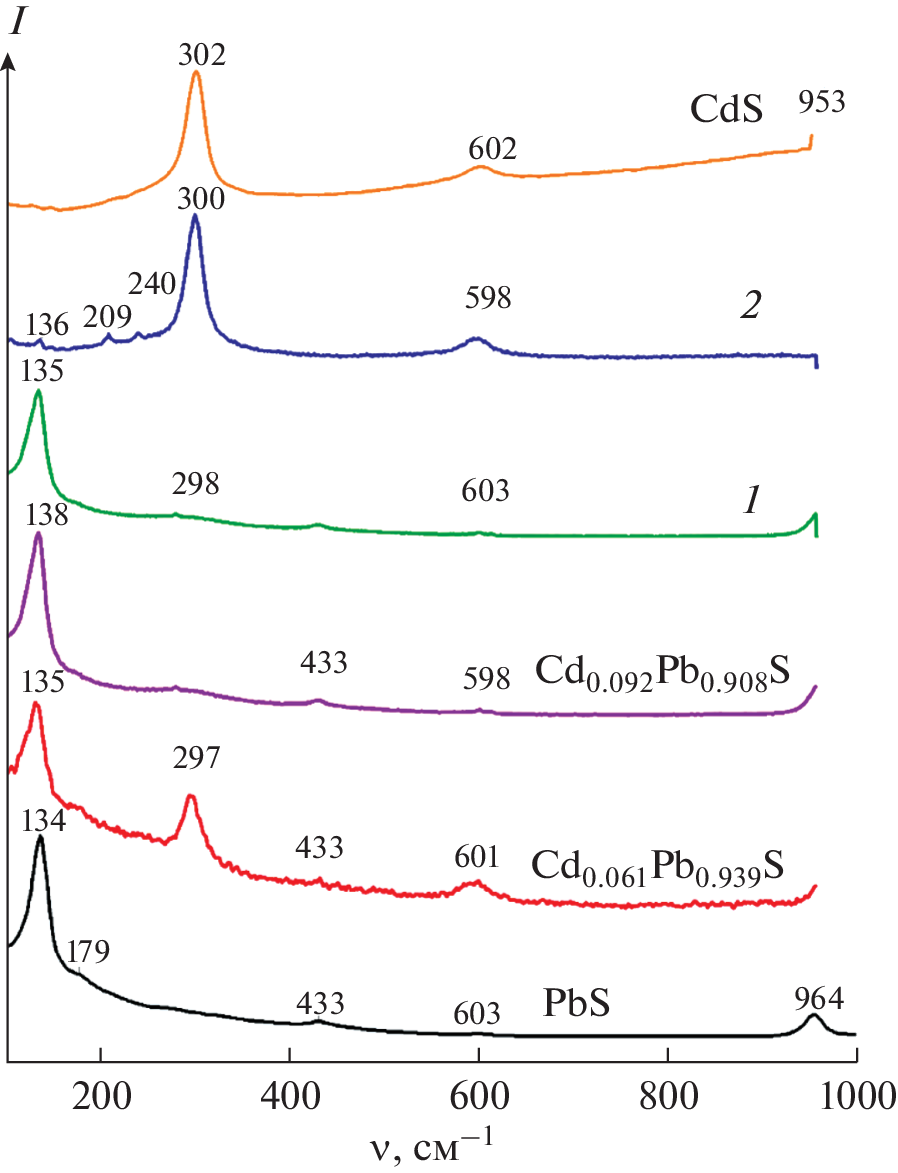 ) were prepared by chemical deposition and characterized by X-ray diffraction, scanning electron microscopy, EDX elemental analysis, and Raman spectroscopy. Once the cadmium sulfate concentration in the batch reached some critical value (0.1 mol/L), the films formed involved two autonomous phases: CdxPb1 – xS substitutional solid solutions and hexagonal cadmium sulfide CdyS of structure В4 (space group P63mc). The method and its parameters as proposed are efficient for manufacturing heterostructures in the CdS–PbS system in one-pot deposition.