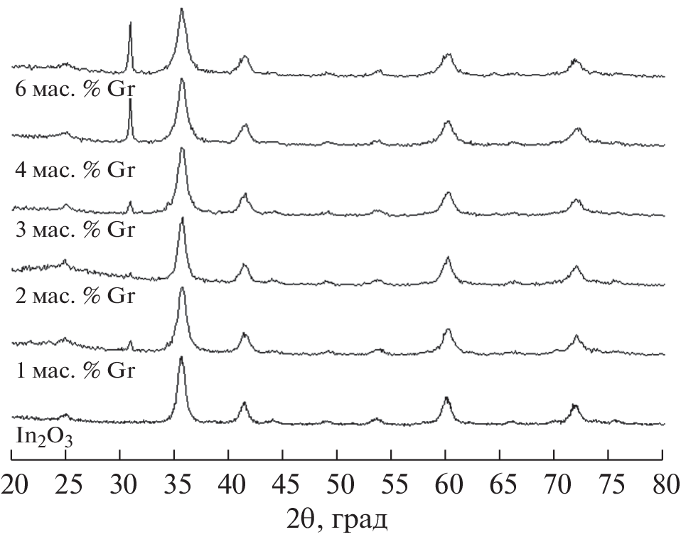 Золь-гель методом получены композиты оксида индия с графеном (содержание графена 0–6.0 мас. %). Исследованы фазовый состав, микроструктура и газочувствительные свойства полученных материалов. Композиты состоят из обособленных фаз In2O3 и графена, при этом графен преимущественно адсорбируется на поверхности зерен оксида (размер кристаллитов оксида индия 8–11 нм). Нанокомпозиты характеризуются повышенной газовой чувствительностью к газам как восстановительной (CH4, ацетон), так и окислительной (NO2) природы. Повышение сенсорного отклика к газам окислительной природы проявляется в заметно большей степени. Можно предположить, что основными факторами, влияющими на сенсорные свойства композиции, являются высокая дефектность фаз In2O3 и графена, возрастание удельной поверхности композитов по сравнению с индивидуальным In2O3, вероятное формирование p–n‑переходов в зоне контакта оксида индия и графена. Введение добавки графена в состав оксида индия способно улучшить основные эксплуатационные свойства одноэлектродных полупроводниковых сенсоров (сенсорный отклик, время срабатывания и восстановления).