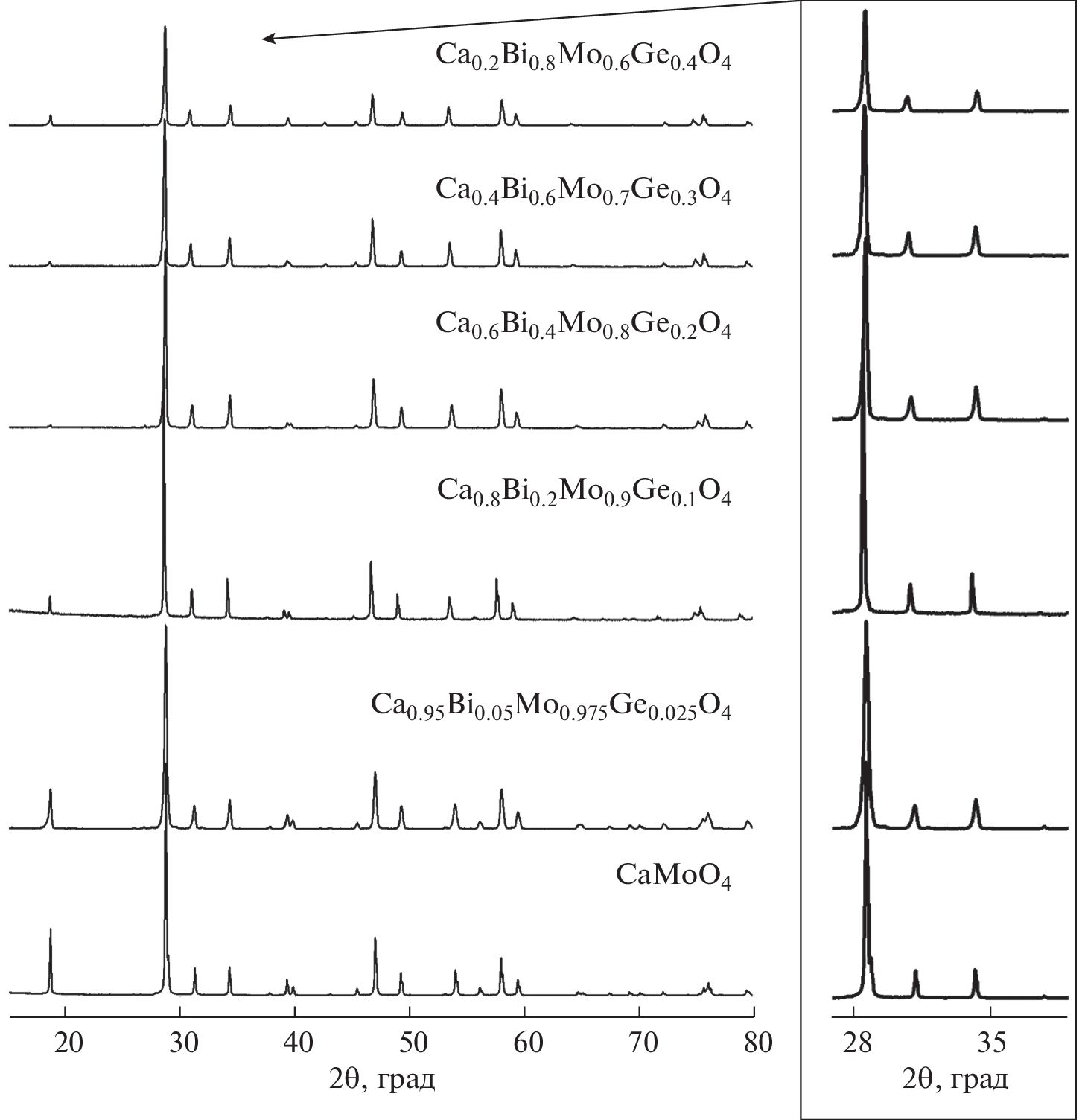 Ca1 – 2xBi2xMo1 – xGexO4 solid solutions with a scheelite-like structure (space group I41/a) and the homogeneity range х = 0.0–0.4 were prepared using standard ceramic technology. The unit cell parameter с and unit cell volume increase as the dopant concentration increases due to the changing size of Ca/BiO8 polyhedra. The predominant thermal expansion of Ca/BiO8 polyhedra was inferred from the temperature-dependent unit cell parameters and Raman spectral patterns. The Ca/Bi–O and Mo/Ge–O bond lengths were calculated. The increasing dopant concentration decreases the thermal expansion coefficient of the ceramics and increases the electrical conductivity and activation energy of the complex oxides compared to the matrix compound. The effective oxygen diffusion coefficient is determined.