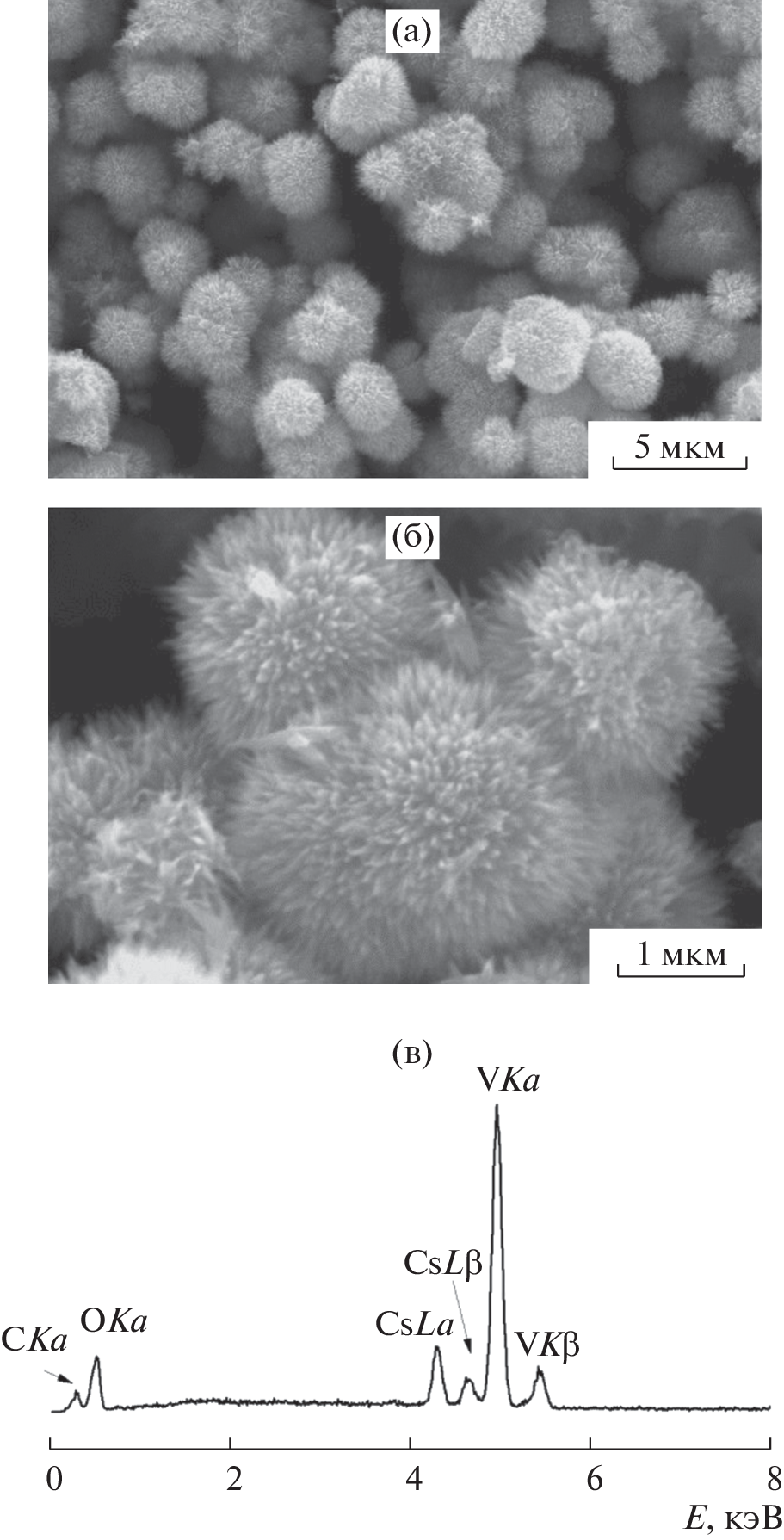 Cesium-containing compounds of hydrated vanadium(V) oxide of general formula СsxV2O5·nH2O, where 0.1 ≤ x ≤ 0.6 and 0.8 ≤ n ≤ 1.2, were prepared by hydrothermal, hydrolytic, and sol–gel processes. The preparation conditions were found to determine the intercalated cation (Cs+) homogeneity range and the vanadium(IV) percentage in the samples. The prepared compounds were characterized by a set of physicochemical methods, namely, IR spectroscopy, X-ray powder diffraction, thermogravimetric analysis, scanning electron microscopy, and low-temperature nitrogen adsorption. The СsxV2O5·nH2O compounds prepared by the hydrolytic and hydrothermal methods had the highest specific surface area, equal to 34.0 and 16.5 m2/g, respectively. The temperature-dependent electrical conductivities of СsxV2O5·nH2O samples were measured to estimate the activation energy of conduction in compounds having various vanadium(IV) percentages. It is only in the high-temperature range that the activation energy of conduction depended on the V4+ percentage in the sample; the least value was found in the hydrothermally prepared Сs0.6V2O5·H2O samples.