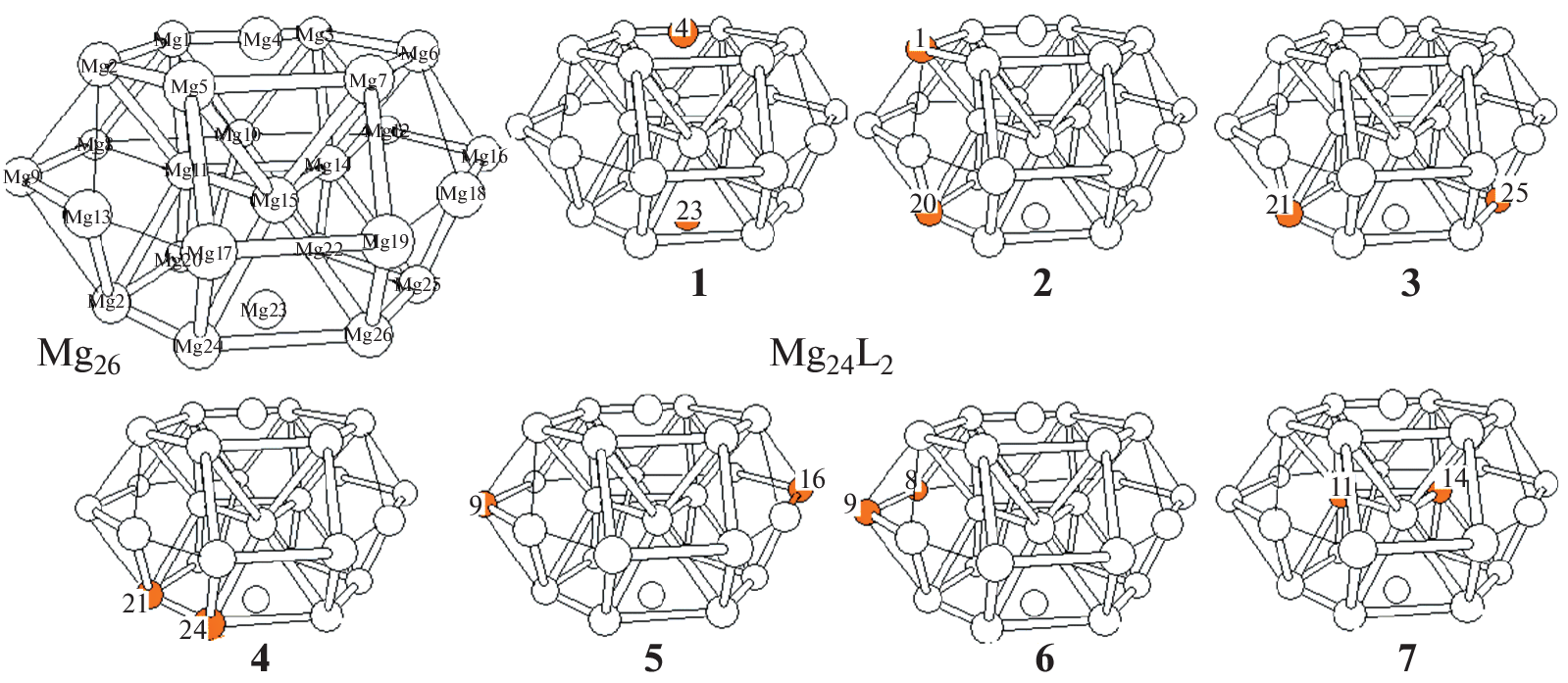 The isomers of Mg24L2 nanoclusters with dopants L from the firt three periods (L = Li–Zn) in the exo- and endohedral positions of the magnesium cage have been calculated by the density functional theory (DFT) method. The effect of dopants on the structure, stability, and position on the energy scale has been studied. For the systems with atoms L = H, Li, Be N, Na, Co, and Cu, the “open” positions of dopants at the surface are more favorable, unlike their analogs with L = Be and B, for which the “closed” positions in the inner cavity of the cluster are more favorable and their promotion to the surface requires a significant energy input. For clusters with O, Si, P, S, and early 3d metal atoms, the differences in the energies of the exo- and endohedral isomers do not exceed a few kcal/mol. The atoms of the second half of the 3d series are characterized by their association into diatomic dopants L2. The results are compared with the data of similar DFT calculations of isomers of Al42L2 aluminum clusters with the same dopants L = Li–Zn and are of interest for modeling the mechanisms of catalytic hydrogenation of magnesium and aluminum nanoclusters at the molecular level.