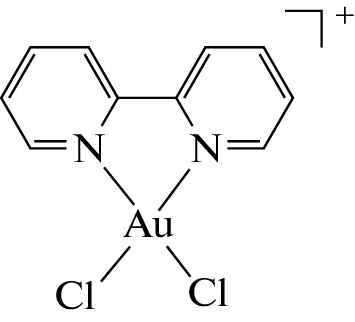 + 2Cl– in aqueous solution at T = 25°C and I = 0.2 M (NaCl), log β1 = 9.22, log β2 = 16.61 have been studied. For bipyridyl complexes Au(bipy)