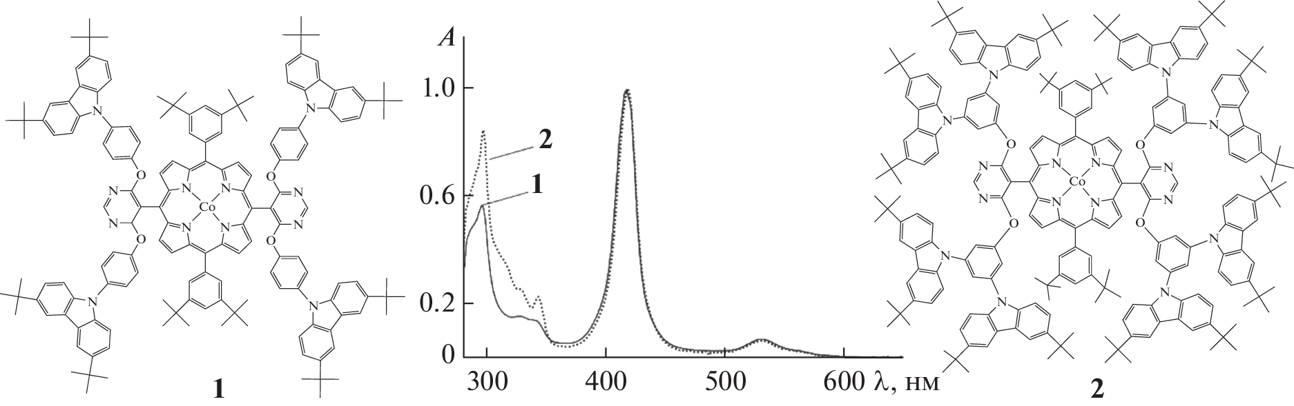 A new dendrimeric cobalt(II) complex CoP has been obtained when reacting (5,15-bis[3,5-bis(tert-butyl)phenyl]-10,20-bis{4,6-bis[3,5-bis(3,6-di-tert-butylcarbazole-9-yl)phenoxy]pyrimidin-5-yl}porphine with Co(AcO)2·4H2O. The process of two-step two-way coordination of 1-methyl-2-(pyridin-4'-yl)-3,4-fullero[60]pyrrolidine (PyC60) with cobalt(II) porphyrin ends with the formation of a stable 1 : 2 complex, a triad of composition (PyC60)2CoP. The process has been completely kinetically described using UV-vis and fluorescent spectroscopy data. The stability constant (K) of the coordination complex is (9.9 ± 2.4) × 108 L2 mol–2 (log K = 9.0). The chemical structure of the triad has been determined by UV-vis, 1H NMR, and IR spectroscopy. The effect of PyC60 fluorescence quenching in the triad has been found and studied, and the static mechanism of the quenching process has been substantiated. The result can be used in optoelectronics to optimize the structures of donor–acceptor systems with the property of photoinduced electron transfer.