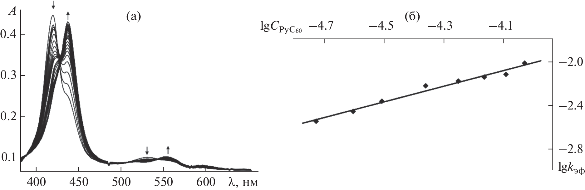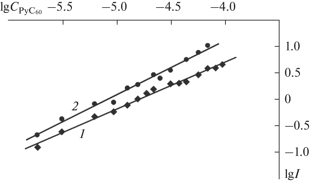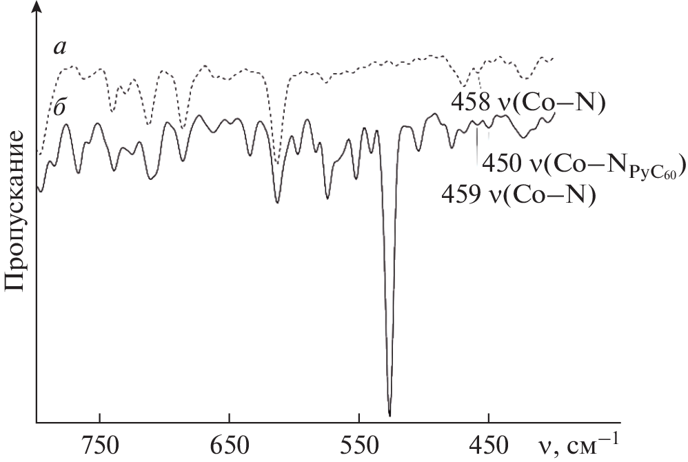 При взаимодействии (5,15-бис[3,5-бис(трет-бутил)фенил]-10,20-бис{4,6-бис[3,5-бис(3,6-ди-трет-бутилкарбазол-9-ил)фенокси]пиримидин-5-ил}порфина с Co(AcO)2 · 4H2O получен новый дендримерный комплекс кобальта(II) CoP. Процесс двухступенчатой двухсторонней координации 1-метил-2-(пиридин-4'-ил)-3,4-фуллеро[60]пирролидина (PyC60) кобальт(II)порфирином, полное кинетическое описание которого получено с помощью методов УФ-видимой и флуоресцентной спектроскопии, заканчивается образованием устойчивого комплекса 1 : 2, триады состава (PyC60)2CoP. Константа устойчивости (K) координационного комплекса равна (9.9 ± 2.4) × 108 л2 моль–2 (lgK = = 9.0). Химическое строение триады установлена методами УФ-, видимой, 1H ЯМР- и ИК-спектроскопии. Обнаружен и изучен эффект тушения флуоресценции PyC60 в составе триады и обоснован статический механизм процесса тушения. Результат может быть использован в оптоэлектронике при оптимизации структур донорно-акцепторных систем со свойством фотоиндуцированного переноса электрона.
