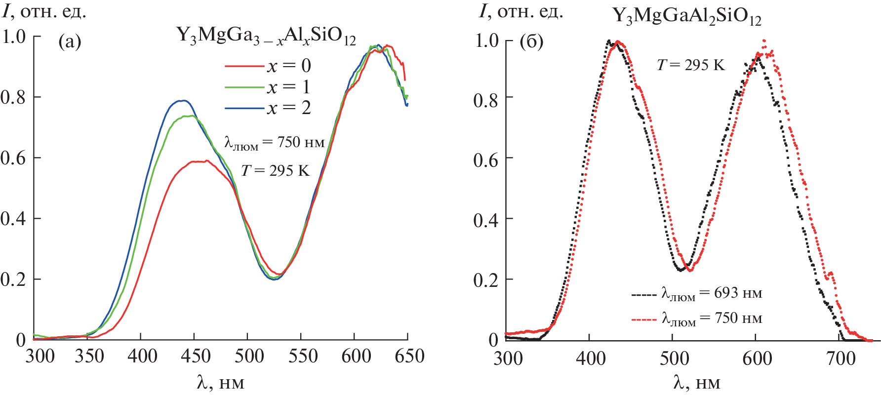 Ceramic samples of Y3MgGa3SiO12, Y3MgGa2AlSiO12, and Y3MgGaAl2SiO12 multicomponent garnets doped with 0.2 at % Cr3+ have been obtained by high-temperature solid-state synthesis. In the luminescence spectra of the synthesized garnet samples, overlapping broadband luminescence is observed in the far red spectral region caused by the 4T2 → 4A2 transition in Cr3+ ions, and a narrow band is observed in the range of 690–700 nm, corresponding to the zero-phonon line of the 2Е → 4A2 transition in Cr3+. The narrow-band and broad-band parts of the spectra are attributed to radiation from two different types of chromium centers, which are in octahedral coordination with different distortion degrees and strength of the crystal field. This results from the presence of two ions at the octahedral position of these garnets, which differ significantly in crystal chemical properties, namely, Mg2+ and Ga3+ (Al3+). The studied phosphors, which have broadband luminescence in the phytoactive far red region of the spectrum, have the potential for use in greenhouse LED lamps.