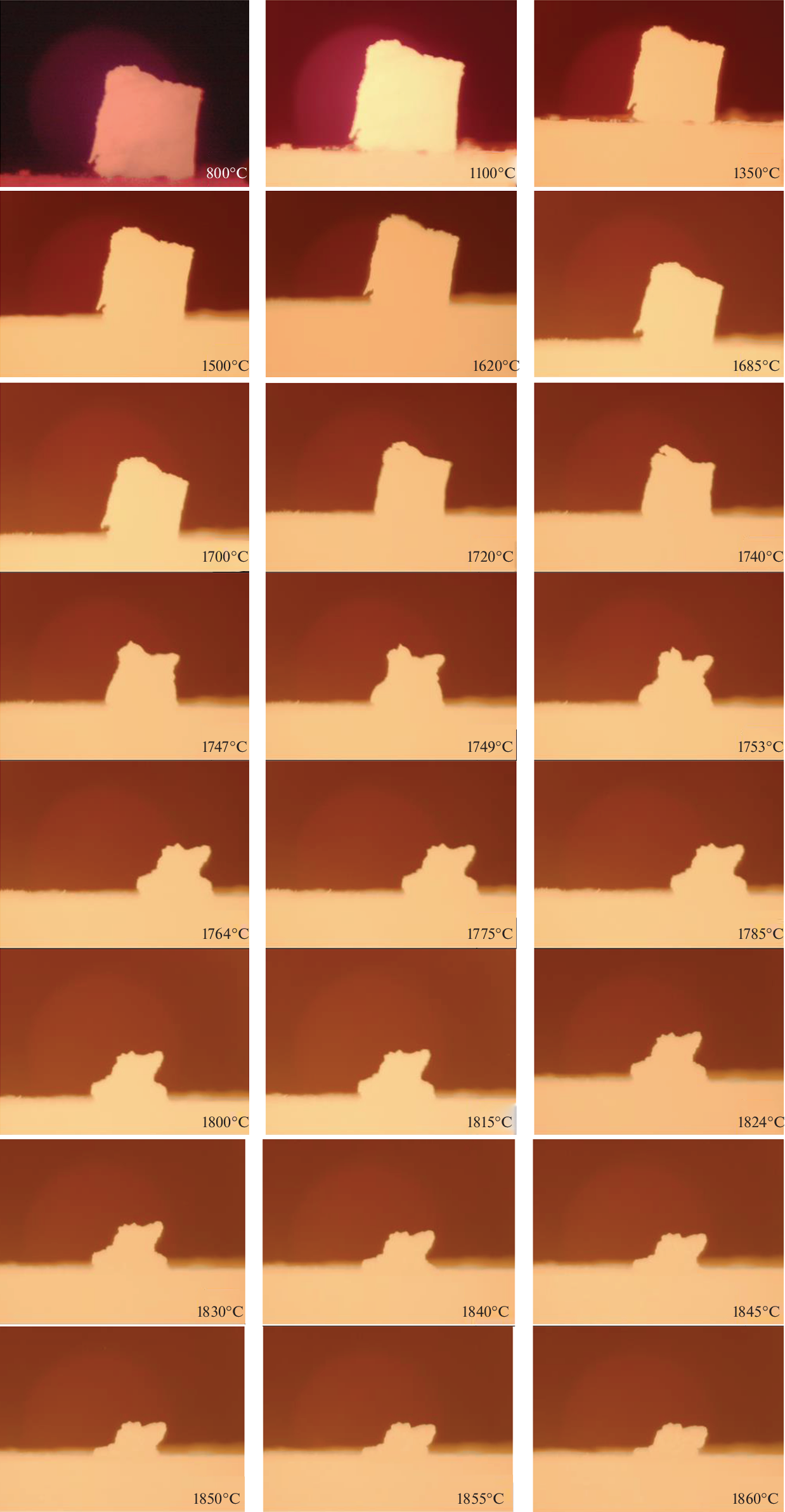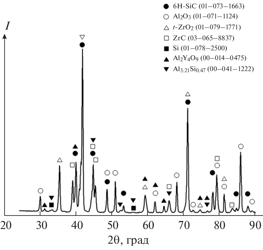 We employed contact alloying in the range 1000–1860°С to study the reaction specifics between SiC and Al2O3−(t + m)ZrO2(Y2O3) oxide composition. Real-time experiments with photographic recording of the changing size and shape of the Al2O3−(t + m)ZrO2(Y2O3) sample on a SiC ceramic substrate showed that Al2O3−(t + m)ZrO2(Y2O3) compositions react with the silicon carbide substrate in the range 1720–1860°С to melt and penetrate into (impregnate) the substrate. X-ray powder diffraction patterns were measured for samples taken from the contact area of the oxide composition with SiC directly on the substrate and in a chipped-off <1-mm-deep near-surface layer. ZrС, Al2Y4O9, and Al3.21Si0.47 were formed in the contact area via redox reactions involving oxide melt, in addition to 6H-SiC, Si and Al2O3, t-ZrO2 phases, which are the initial components of the substrate and oxide composition, respectively.