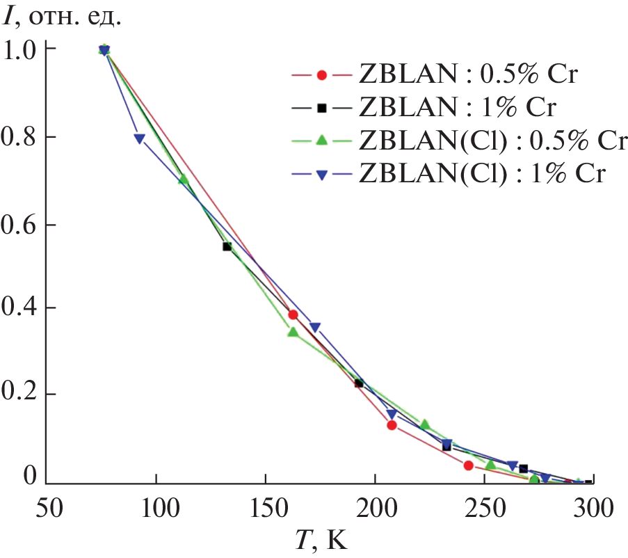Chromium trifluoride-doped fluoride glasses in the ZrF4–BaF2–LaF3–AlF3–NaF (ZBLAN) system with partial substitution of fluorine for chlorine have been synthesized. The spectral data obtained confirm that chromium ions enter the glass structure and exhibit broadband luminescence caused by the 4T2 → 4A2 transition in the Cr3+ ion. The observed long-wavelength shift of the broadband luminescence band and Cr3+absorption bands in fluoride–chloride glass compared to fluoride glass corresponds to the expected behavior of the Cr3+ luminescence and absorption spectra when fluoride ions are replaced by chloride ions, which should lead to a weakening of the strength of the crystal field acting on Cr3+ ions. At room temperature, the luminescence of Cr3+ ions at 888 and 908 nm is strongly quenched due to the thermally stimulated nonradiative transition from the 4T2 excited state to the 4A2 ground state.