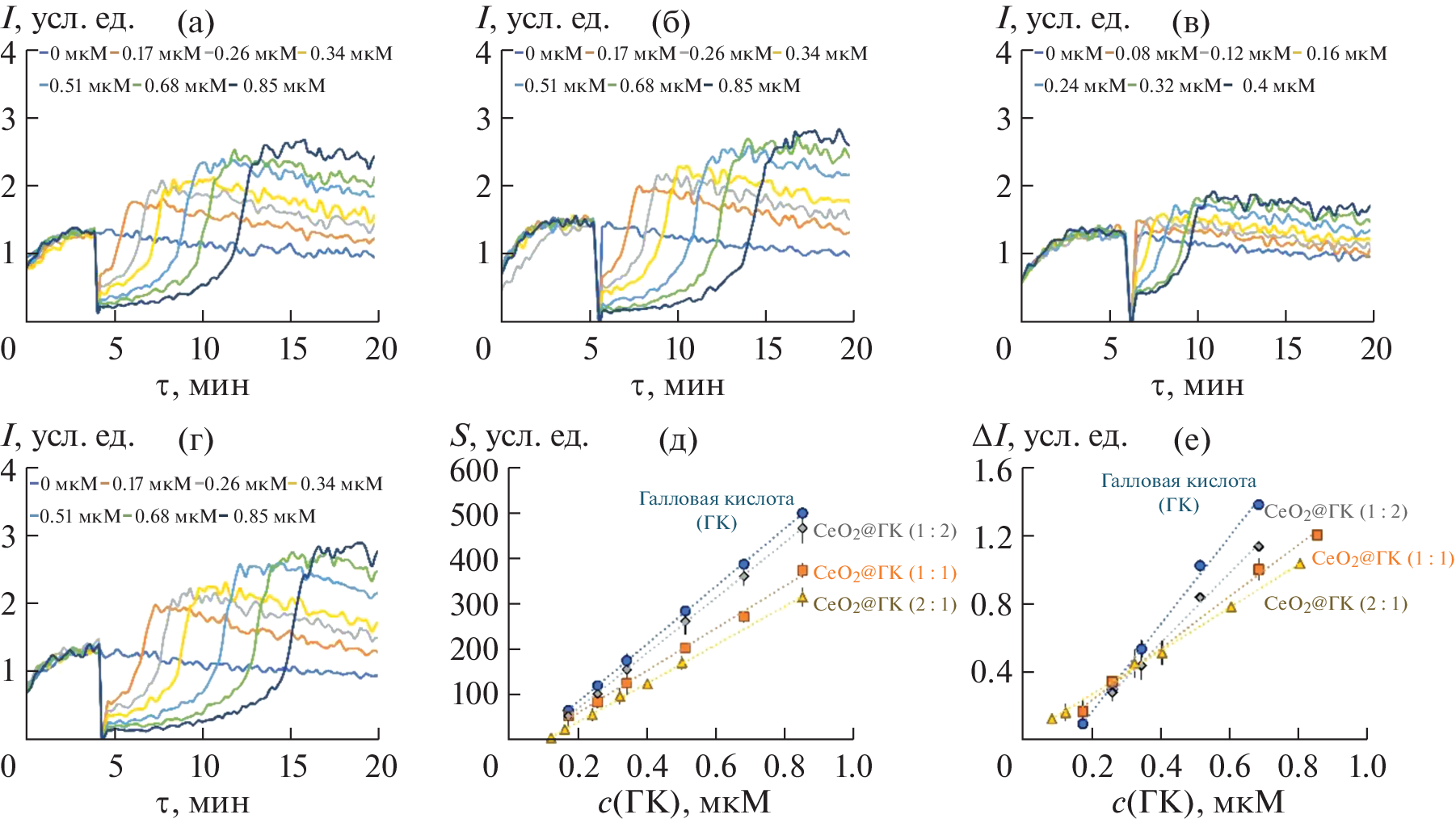 Cerium oxide sols functionalized with gallic acid (GA) in various molar ratios (CeO2@GA, 1 : 1, 1 : 2, and 2 : 1) were synthesized for the first time. The antioxidant activity of the obtained nanomaterials towards alkylperoxyl radicals was analyzed by the luminol-enhanced chemiluminescence assay. It was shown that CeO2@GA composites possess different types of redox activity, combining antioxidant and pro-oxidant properties. It was found that the redox activity of CeO2@GA composites is largely due to the ligand, gallic acid. Meanwhile, the immobilization of gallic acid on the surface of cerium dioxide nanoparticles leads to a decrease in its antioxidant and pro-oxidant activities. This effect is most pronounced in the case of the 2 : 1 CeO2@GA sol, in which the antioxidant and pro-oxidant capacities of gallic acid have decreased by 40 ± 3 and 58 ± 9%, respectively.