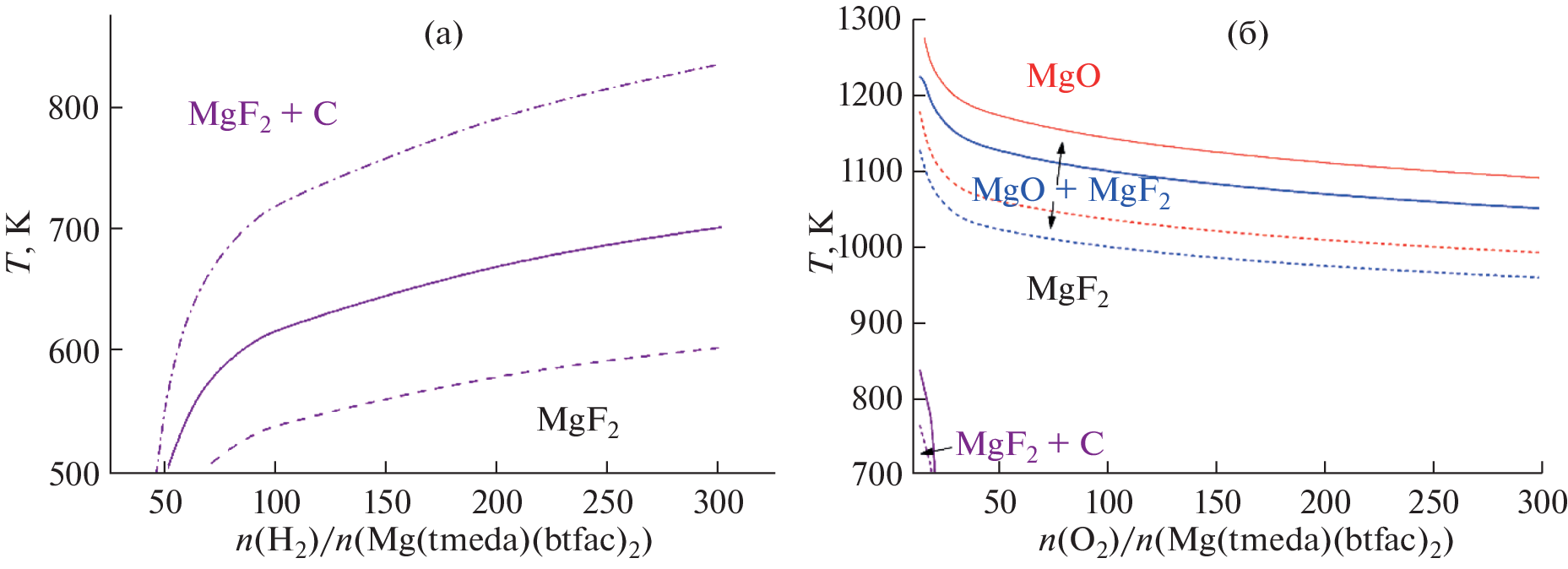 = 163 ± 6 kJ/mol, ΔsublS427 = 293 ± 14 J/(mol K)). The substance passes into the gas phase with partial decomposition. Thermodynamic modeling of the composition of condensed phases formed from Mg(tmeda)(btfac)2 with the addition of H2 or O2 has been performed depending on the temperature (700–1300 K), total pressure (133–13 332 Pa), and the ratio of the reagent gas to the precursor (0–300). The data obtained can be used to determine the experimental parameters of the processes for obtaining functional layers. Comparison of the results with a similar trifluoroacetylacetonate complex made it possible to quantitatively reveal the effect of replacing the methyl group in the anionic ligand with a phenyl one.
