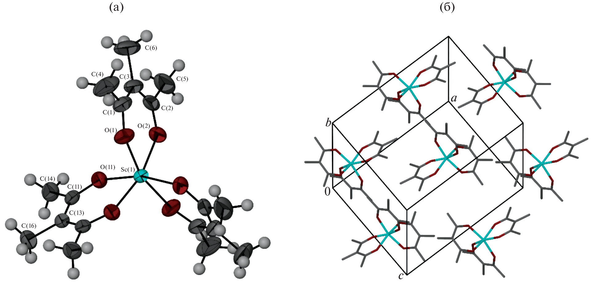 Complexes Sc(Meacac)3 and Fe(Meacac)3 (Meacac is 3-methyl-2,4-pentanedionate anion) have been synthesized, and their crystal structures have been first determined by X-ray diffraction. The volatility and thermal stability of the obtained compounds have been studied. The temperature, enthalpy, and entropy of melting of the complexes have been determined by differential scanning calorimetry. The flow method has been used to obtain the temperature dependence of the saturated vapor pressure of Sc(Meacac)3 in the range 414–472 K, from which the thermodynamic characteristics of the sublimation process have been calculated at an average temperature (
