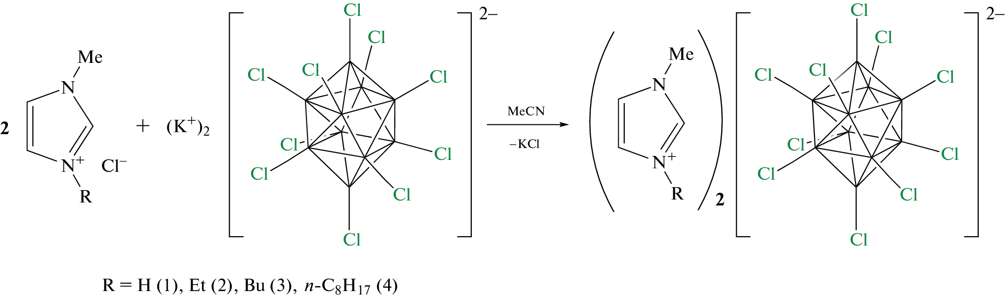 A new method for the synthesis of imidazolium salts of the perchlorinated closo-decaborate anion (RMIM)2[B10Cl10] (R = H, n-Et, n-Bu, n-C8H17) has been proposed. The synthesis of these compounds can be carried out by simple metathesis reactions between the potassium salt of the decachloro-closo-decaborate anion K2[B10Cl10] and chlorides of imidazolium derivatives. The crystal packings and intermolecular interactions in compounds (EMIM)2[B10Cl10] and (BMIM)2[B10Cl10] have been studied using X-ray diffraction and Hirshfeld surface analysis. The [B10Cl10]2– anions in the crystal lattice of these compounds are linked by a network of weak Cl···Cl interactions with a distance between chlorine atoms of 2.246–3.623 Å.