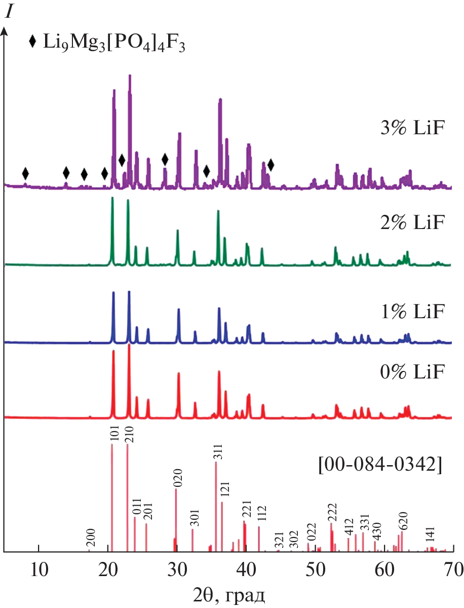 Впервые проведено исследование литий-магниевого фосфата LiMgPO4, допированного фтором. Обнаружено, что фтор значительно усиливает интенсивность термостимулированной люминесценции. Для нахождения предпочтительных позиций фтора и структурных искажений, вызванных гетеровалентным замещением, в работе выполнены первопринципные расчеты, которые показали, что фтор не входит в тетраанион (PO4)3–, а способствует образованию кластеров, содержащих одновременно ионы лития и фтора.