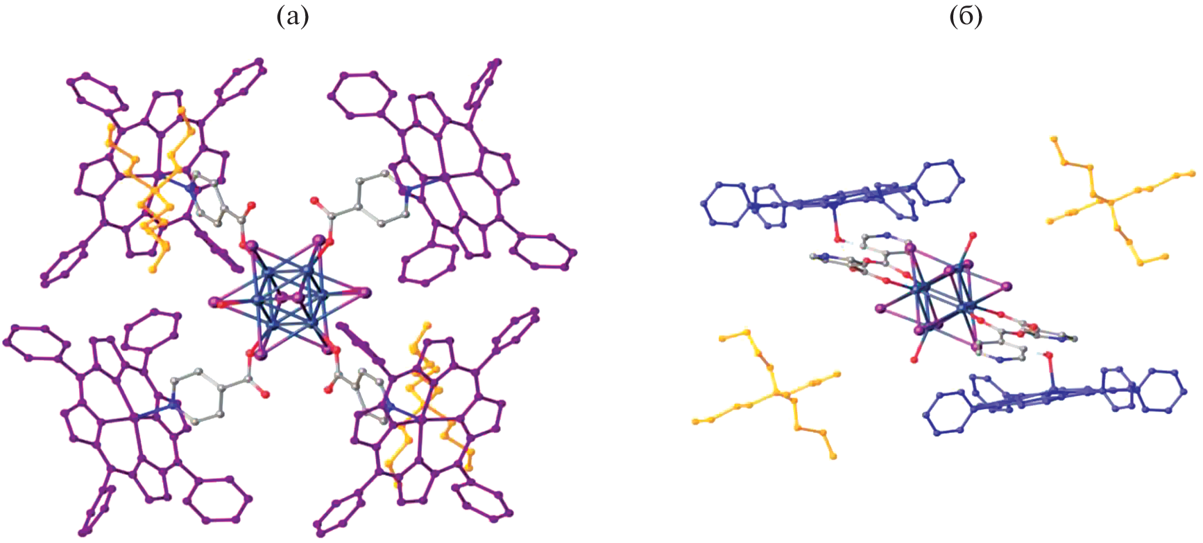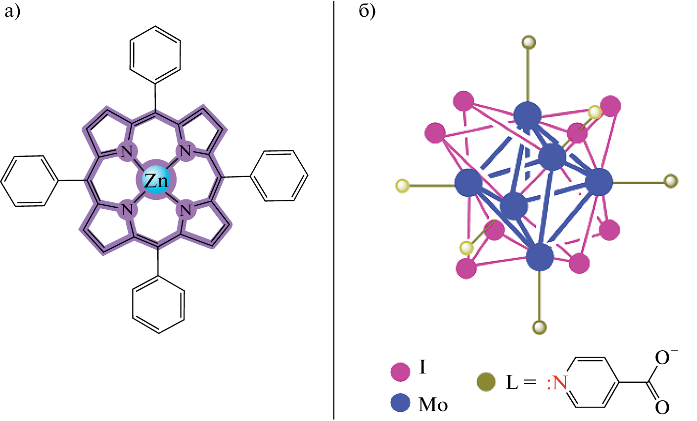 Продемонстрирована возможность образования супрамолекулярных гибридов на основе двух фотосенсибилизаторов – октаэдрического йодидного кластера молибдена(II) с шестью терминальными изоникотинатными лигандами (Bu4N)2[{Mo6I8}(OOC–C5H4N)6] (PyMoC, С) и порфирината цинка(II) А4-типа (ZnTPP, P). Методами спектрофотометрического титрования и ЯМР показано, что формирование комплексов СPn (n = 1–6) происходит в растворах некоординирующих хлорорганических растворителей за счет образования координационных связей металл–N-лиганд между компонентами. Использование октаэдрического кластера в качестве гексатопного N-лиганда и лабильность связей Zn…NPy в совокупности приводят к образованию серии комплексов СPn (n = 1–6), находящихся в динамическом равновесии в растворе. Несмотря на это, удалось подобрать условия и получить монокристаллы индивидуальных форм CP4 + 2 и CP6 + 2, методом рентгеноструктурного анализа определено их строение. Установлено, что кластер PyMoC координирует четыре или шесть молекул ZnTPP соответственно, при этом обе структуры содержат две “экстрамолекулы” порфирината цинка(II), связанные с кластером за счет водородных связей между атомами кислорода изоникотинатных групп и протонами воды, аксиально координированной к порфириновому металлоцентру.