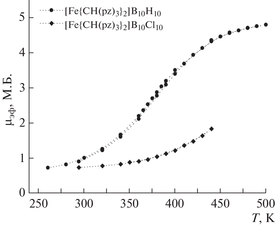 The results of synthesis and study of magnetically-active iron(II) complexes with polynitrogen heterocyclic ligands and outer-sphere boron cluster anions have been considered. Derivatives of 1,2,4-triazole, tris(pyrazol-1-yl)methane, and 2,6-bis(imidazol-2-yl)pyridine have been used as ligands, decahydro-closo-decaborate, dodecahydro-closo-dodecaborate, decachloro-closo-decaborate, and 1,5,6,10-tetra(R)-7,8-dicarba-nido-undecaborates (R = H, Cl, Br) have been studied as outer-sphere anions. A number of iron(II) complexes showing spin crossover accompanied by thermochromism in the majority of cases has been obtained. Effect of ligand nature and cluster anion on temperature (Tc) and spin transition character has been considered. In particular, it has been shown that introduction of substituent increasing electron density over the system of conjugated three-centered two-electron bonds in cluster anion leads to increase in the field strength of ligand bound to anion via network of hydrogen bonds.