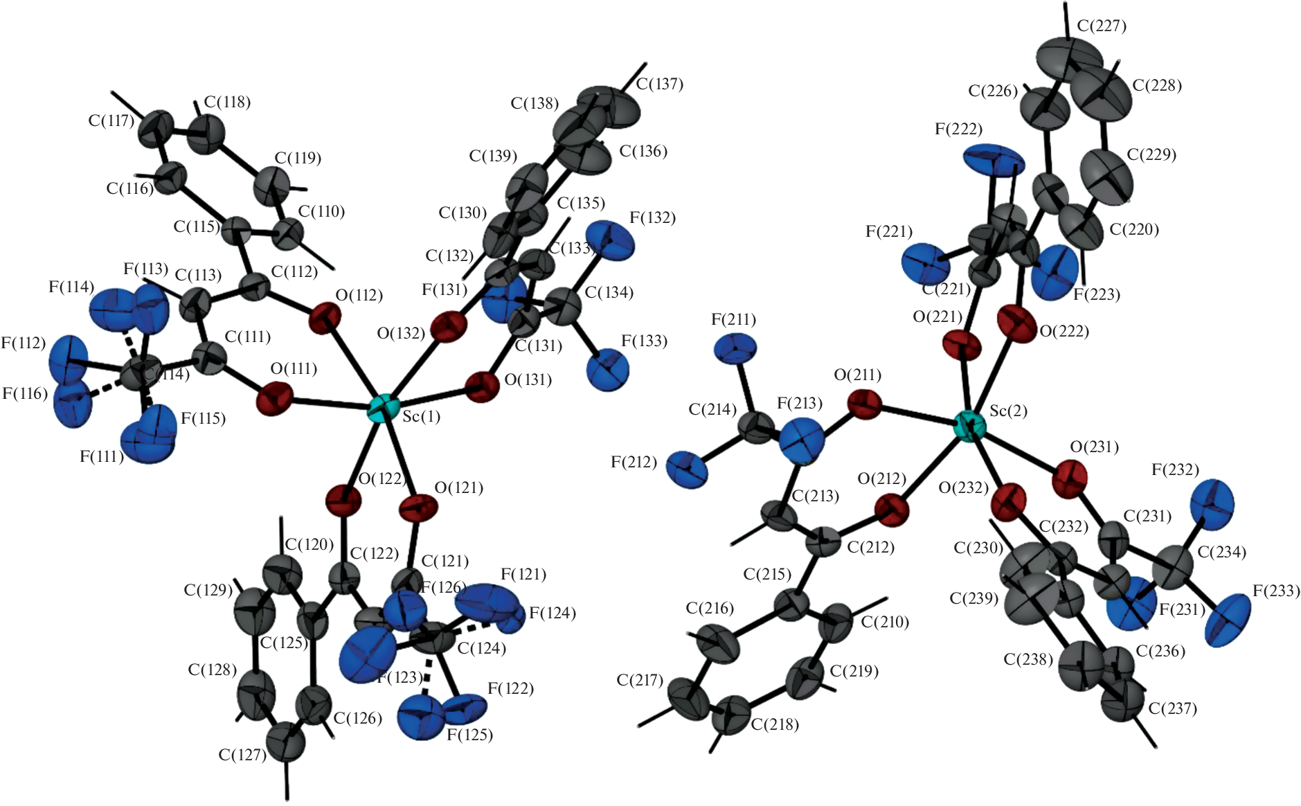 = 212 ± 9 J/(K mol). The structure and thermal properties of scandium benzoyltrifluoroacetonate were compared to those of similar scandium tris-β-diketonate complexes