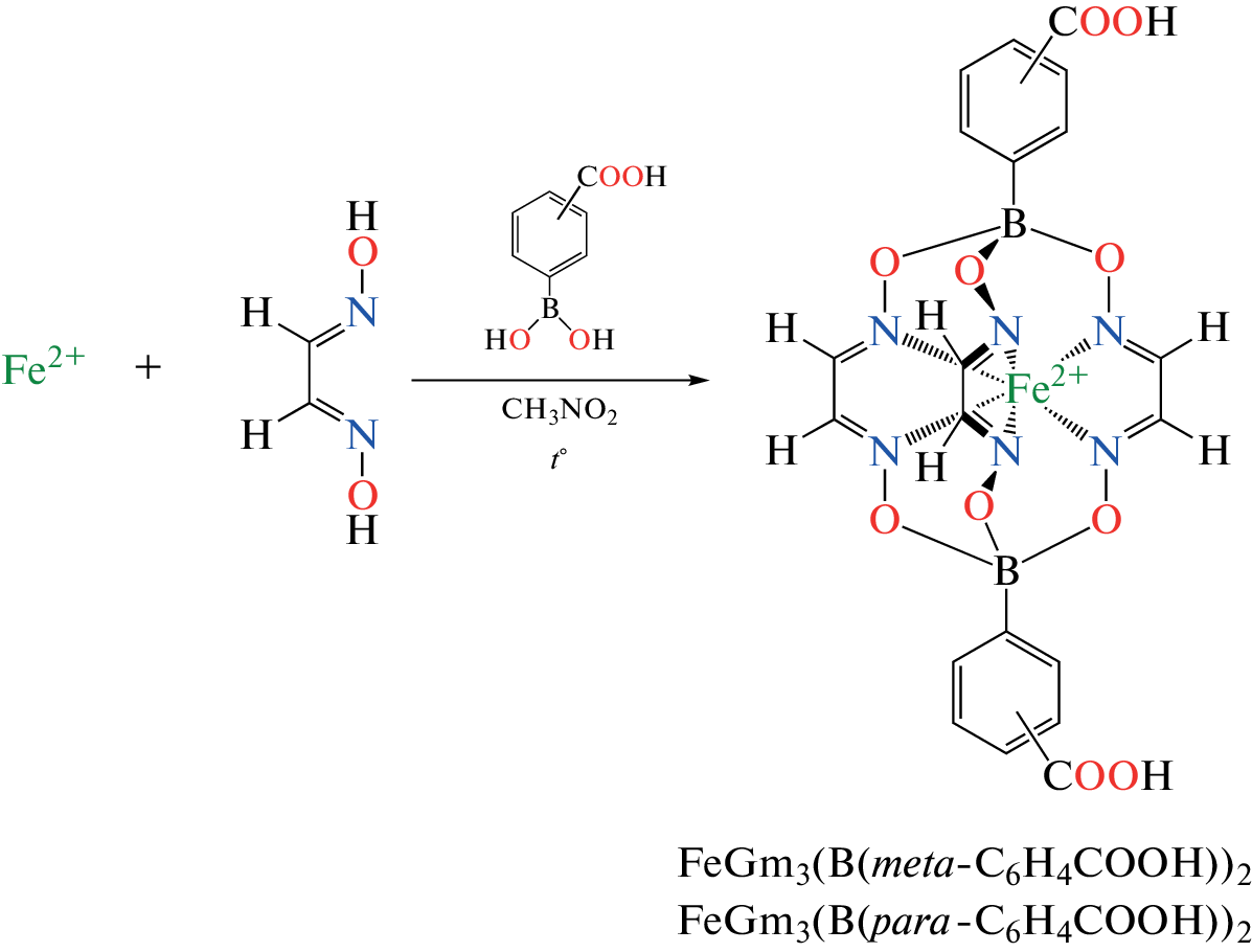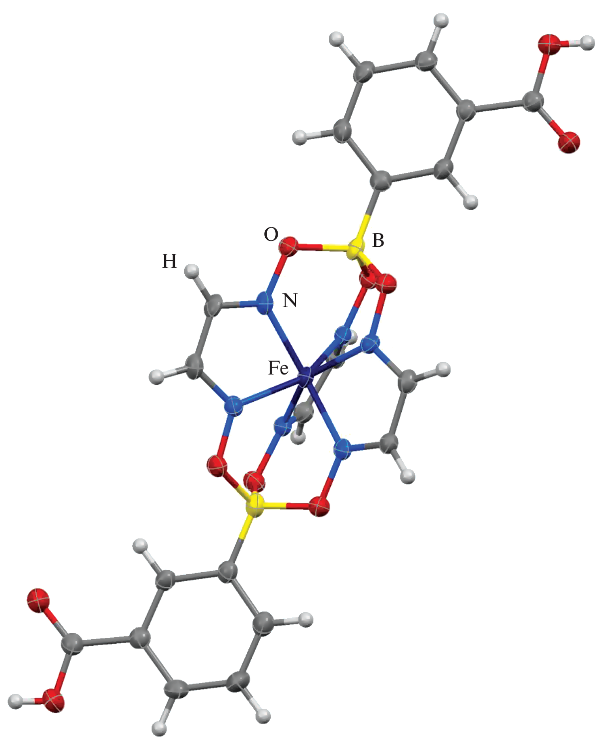 Template condensation of the chelating α-dioximate ligand synthon—glyoxime and the appropriate cross-linking agent—monofunctionalized boronic (3-carboxyphenylboronic or 4-carboxyphenylboronic) Lewis acid in a boiling nitromethane as a solvent on the iron(II) ion as a matrix afforded the dicarboxyl-terminated iron(II) tris-glyoximates with functionalizing meta- and para-substituents in their apical boron-based aromatic fragments. The composition and structure of these macrobicyclic complexes were confirmed using elemental analysis, UV-vis, 1H and 13C{1H} NMR spectra. Their crystal and molecular structures were obtained by the single crystal X-ray diffraction experiments. Asymmetric units of their crystals contain, besides of a clathrochelate molecule, two solvate molecules, which form hydrogen bonds with its functionalizing carboxyl groups. The C–O bond lengths in these terminal groups and a possibility of localization of hydrogen atoms on the difference Fourier maps clearly demonstrate that the formation of such associates does not include a deprotonation of the macrobicyclic complex and its intracomplex molecules remain neutral. The encapsulated iron(II) ion in their molecules occupies a centre of its FeN6-coordination polyhedron. Its geometry is intermediate between a trigonal prism (TP, the distortion angle φ = 0°) and a trigonal antiprism (TAP, φ = 60°); the values of φ are equal to 17.1 and 18.9°, respectively. Fe–N distances vary from 1.901(2) to 1.924(2) Å, thus suggesting a low-spin diamagnetic state of the encapsulated iron(II) ion. The C=N bonds in the donor oxime groups are shortened, while the С–С bonds in the chelating glyoximate fragments are elongated, as compared with those in their aliphatic analogs. Free rotation of the apical aromatic substituents at the cross-linking boron atoms around the ordinary B–C bonds caused the absence of their coplanarity. The intramolecular distances С···С between the terminal carboxyl groups in the apical cross-linking fragments are equal to 15.693(4) and 17.888(3) Å for the clathrochelate meta- and para-isomers, respectively. The aforementioned rotation allows to achive an angular geometry of the prospective meta-dicarboxyloclathrochelate ligand with a formation of ∠C···Fe···C close to 145° between its terminal O‑donor carboxyl groups. This complex can play a role of both the angular and linear 3D-ligands, while its clathrochelate para-substituted isomer seems to be the prospective linear metalloligand.