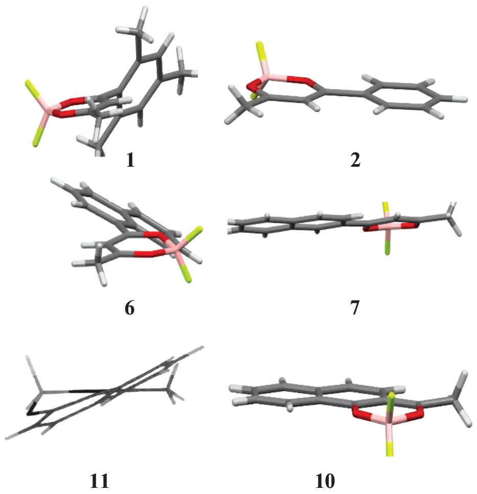 Phosphorescence data on boron difluoride β-diketonates of various structure have been systematized. Nonplanar boron difluoride molecules are characterized by the inversion of the S1 and T2 levels, which promotes efficient population of triplet levels and intense phosphorescence or delayed fluorescence of crystals. Planar molecules are characterized by a classical sequence of singlet and triplet levels and a coplanar arrangement of antiparallel molecules, which contributes to excimer delayed fluorescence.