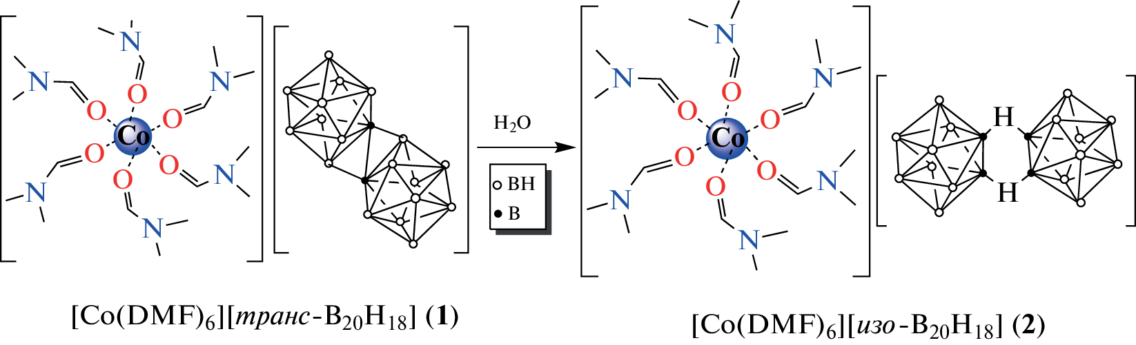 Coordination compounds [Co(DMF)6][B20H18] containing isomeric forms of the macropolyhedral cluster [trans-B20H18]2– and [iso-B20H18]2– have been synthesized. Complex [Co(DMF)6][trans-B20H18] has been prepared by the reaction of a salt of the boron cluster anion with cobalt(II) chloride in dimethylformamide; complex [Co(DMF)6][iso-B20H18] has been isolated when recrystallized from water during spontaneous isomerization of the macropolyhedral cluster. The coordination compounds have been identified by IR spectroscopy, 11B NMR spectroscopy, and X-ray diffraction analysis.