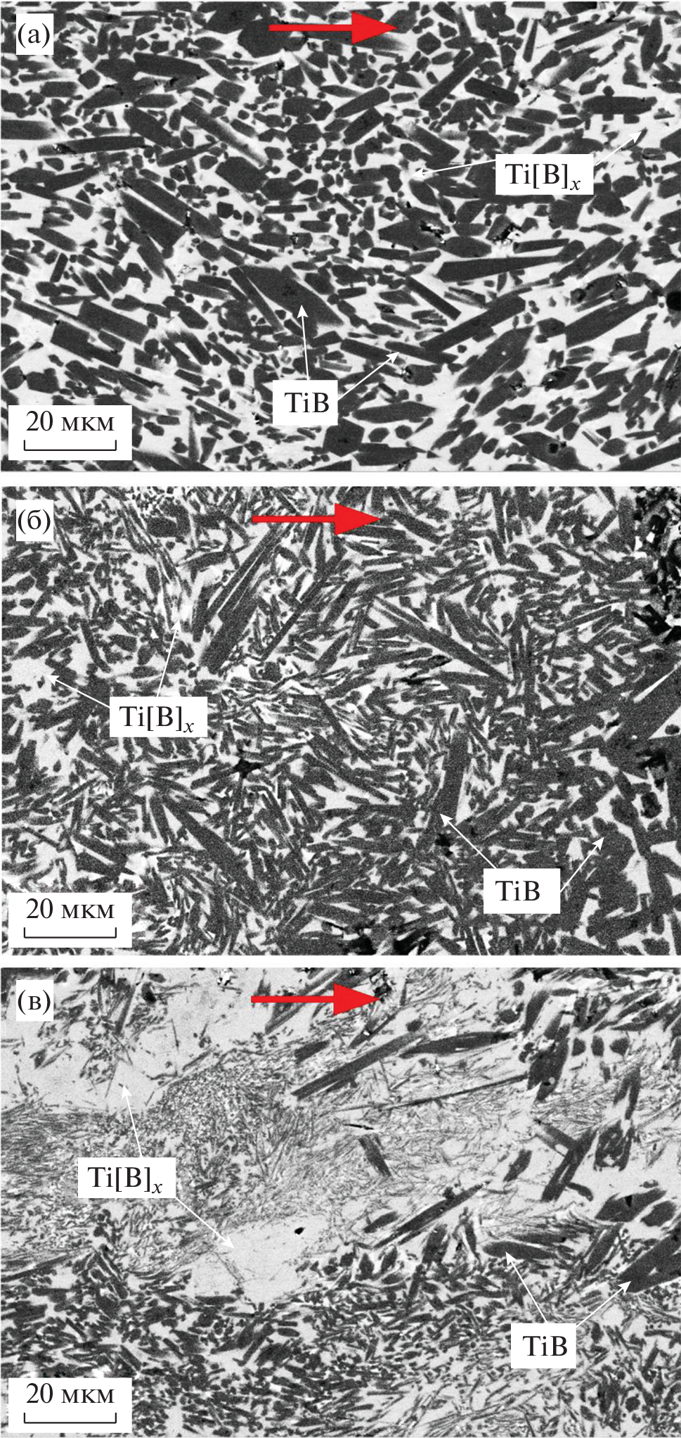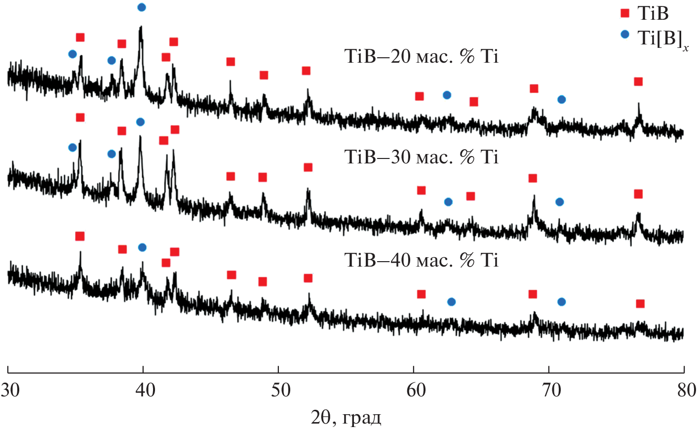 We studied how the ratio of precursor titanium and boron powders influenced the combustion temperature and combustion velocity in the high-temperature self-propagating synthesis (SHS) mode, and the microstructure, phase composition, and mechanophysical properties of rods fabricated by SHS extrusion. The subject matters of the study were materials for which the as-batch phase compositions of products were TiB–(20–40) wt % Ti. The formation of boron solid solution in titanium was considered. Scanning electron microscopy (SEM), X-ray powder diffraction (XRD), and mechanical measurements implied the texture of the prepared materials (TiB whiskers were aligned in the direction in which the external pressure was applied). In all of the composites studied, the conductivity was close to the conductivity of undoped titanium; the electrical resistance increased slightly in response to increasing boron weight fraction. The three-point bending strength of the material increased by a factor of 1.7 at most as the weight fraction of boron solid solution in titanium increased from 20 to 40 wt %.