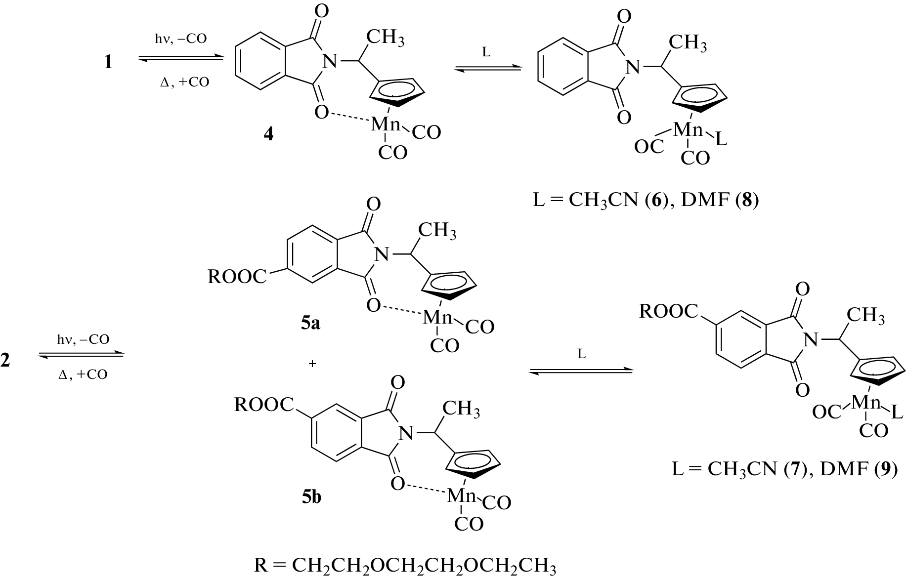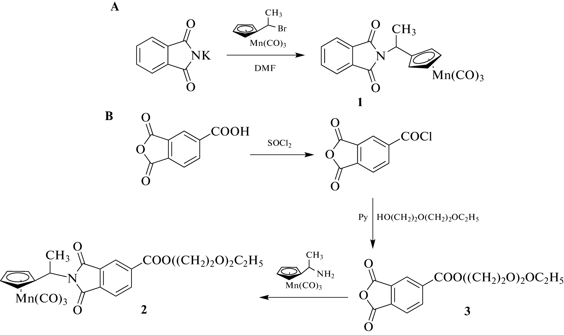 The results of investigation of the optical and electrochemical properties of substituted phthalimides linked to a cymantrenyl moiety by IR and NMR spectroscopy, UV-Vis spectroscopy, and cyclic voltammetry and also by DFT calculations are presented. It was shown that the optical, donor-acceptor, and redox properties of the organometallic phthalimides are affected by substituents in position 1 of the side chain of the cymantrene Cp and in position 4 of the phthalimide benzene ring. The reactions of dicarbonyl chelates with external ligands in the dark attest to hemilability of the Mn–O=C(imide) bond.