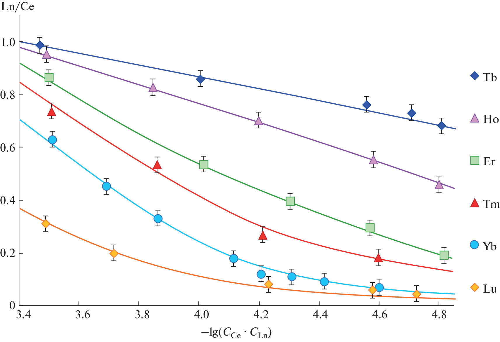 A series of 32 heterometallic ionic complexes [CeNi6(Ala)12][(LnxCe1 – x)(NO3)3(OH)3(H2O)] (Ln = Tb, Ho, Er, Tm, Yb, Lu) have been synthesized and characterized by XRD and IPC-MS. The dependence of the degree of substitution of lanthanides in the anionic position on the nature of Ln3+ and precipitation conditions has been determined. The processes occurring during the formation of the complexes have been studied by UV-Vis, diffuse reflectance electronic spectroscopy, and ICP-MS. Based on these data, a model of equilibria in the system was proposed to explain the increase in the degree of substitution of Ln in the anionic position in the lanthanide series and with a decrease in the concentration of Ce and Ln in the solution from which precipitation is performed.