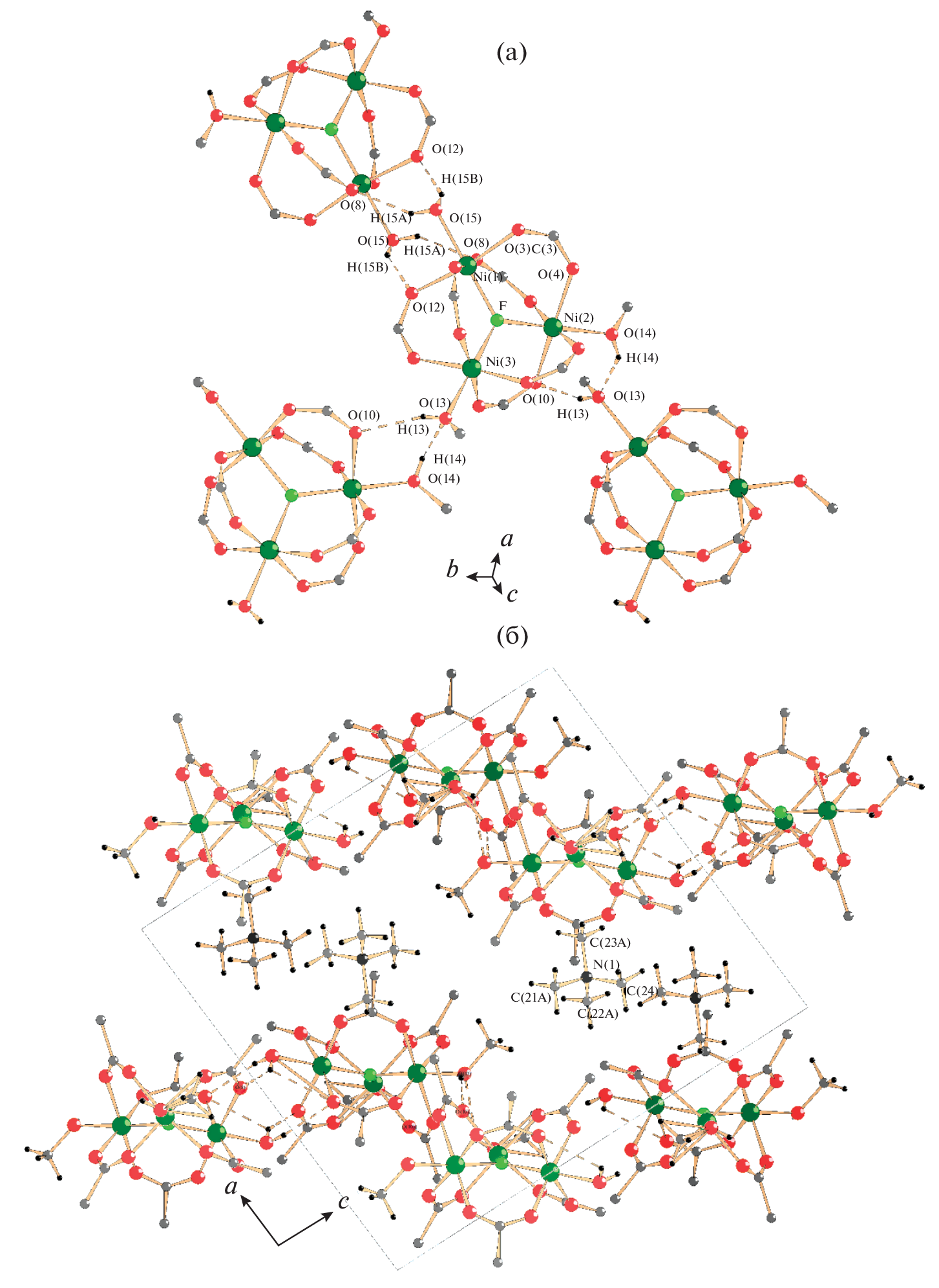 Trinuclear complexes Me4N[Ni3(µ3-F)(TFA)6(MeOH)2(H2O)] (1) and Me4N[M3(μ3-F)(TFA)6(py)3] (M = Mn (2), Co (3), Ni (4), Cu (5), Zn (6)) have been synthesized by crystallization from methanol solutions. Single-crystal X-ray diffraction shows that compounds 1–6 are composed of tetramethylammonium cations Me4N+ and trinuclear triangular anions [Ni3(µ3-F)(TFA)6(MeOH)2(H2O)]– (1) or [M3(μ3-F)(TFA)6(py)3]– (2–6) centered by the μ3-F atom. The bridging trifluoroacetate anions (TFA–) located along the triangle edges link pairs of M2+ cations, and the axial positions are occupied by MeOH, H2O, or pyridine (py) molecules. In 2, the pyridine molecules are nearly coplanar with the [M3F] triangle, while in the other structures they are turned almost perpendicularly. The different orientations of py molecules lead to different packing motifs: columns of alternating trinuclear anions and Me4N+ cations are formed in 2, while in 3–6 anions and cations form neutral layers. A significant role in the organization of structures 1–6 is played by non-covalent interactions, such as hydrogen bonds and stacking and CH···π interactions. Heating complexes 2–4 above 200°С turns out to lead to a stepwise thermal decomposition, which begins with the elimination of py and ends with the formation of d-metal fluoride above 300°С.